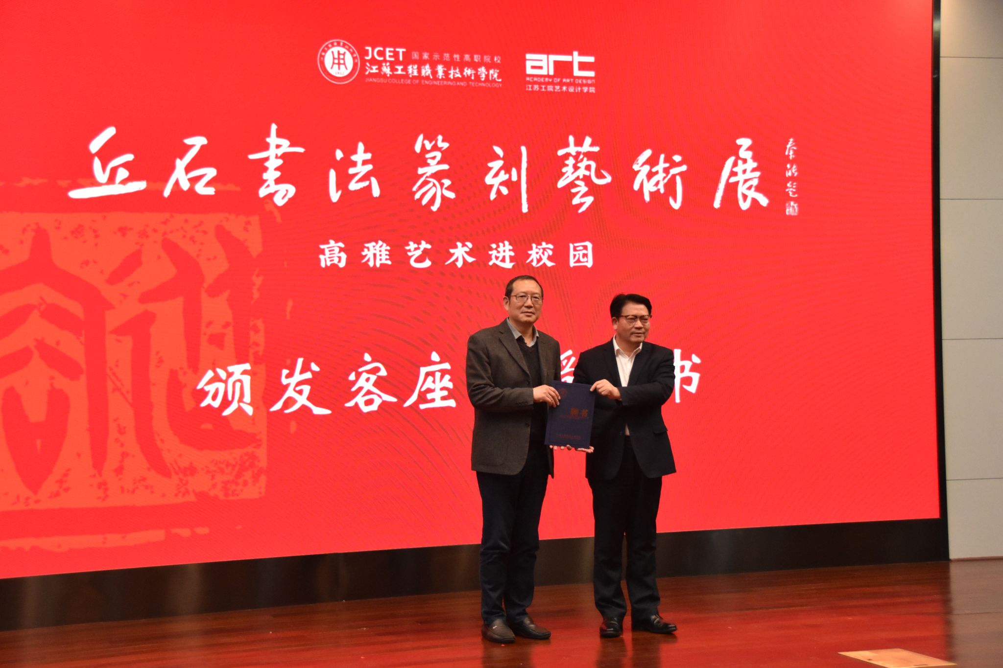 秦志林在致辞中对丘石先生初心不忘,志趣不改的精神表示赞赏,并表示我校愿和文化艺术界一起,努力为中华优秀传统文化的交流传承和艺术教育的创新发展作出积极贡献。陆锦军向丘石颁发了客座教授聘书。南通市书法家协会顾问、著名书法家秦能为本次艺术展题字并作了讲话。