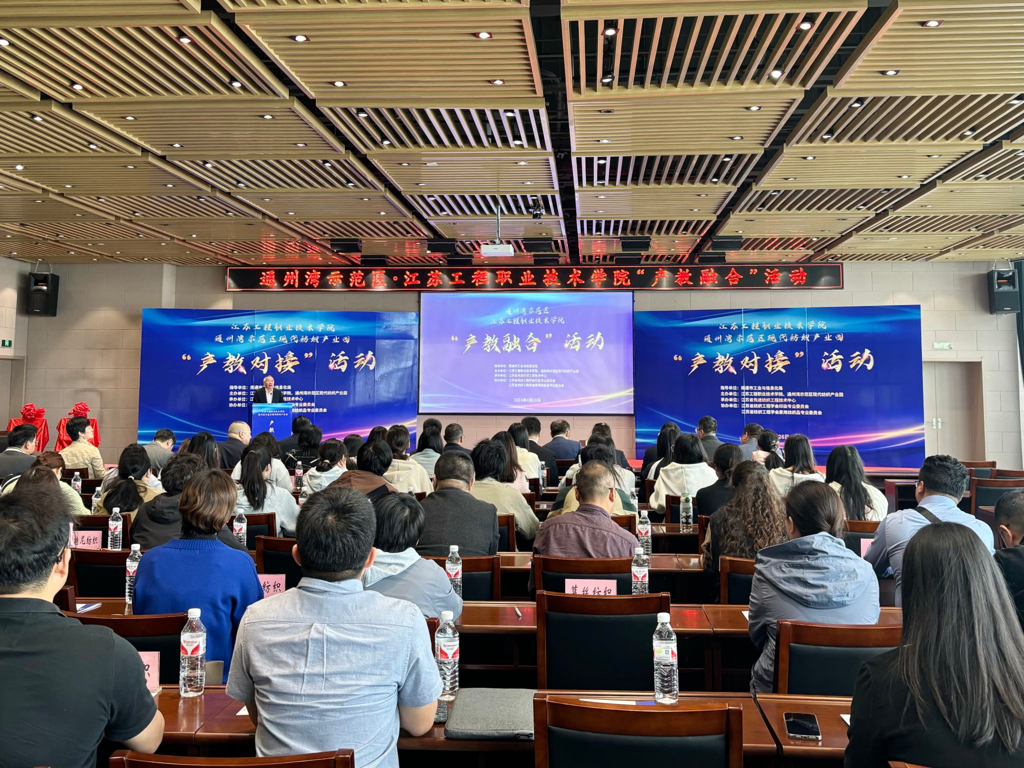 4月26日,我校与通州湾纺织产业园产教对接活动在通州湾举行。市工信局四级调研员陈宇荣、消费品处处长张姜,通州湾示范区党工委副书记石星恺,校党委副书记邓海龙率队出席此次活动。来自通州湾纺织印染企业、江苏工院师生共150人参会。