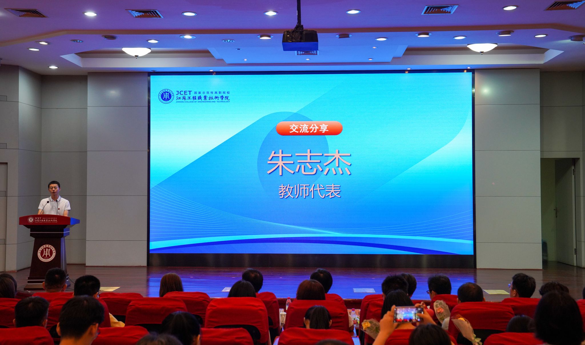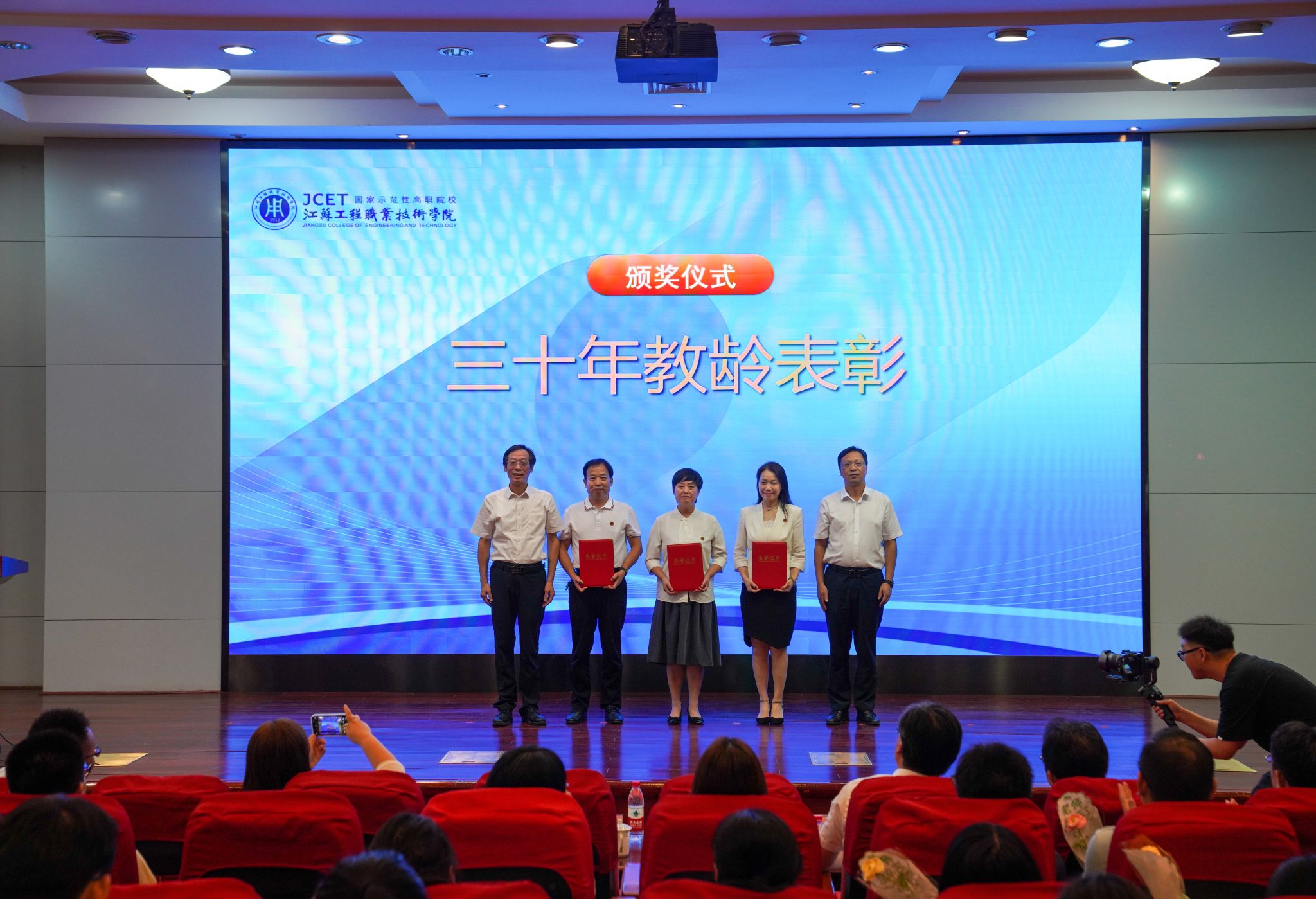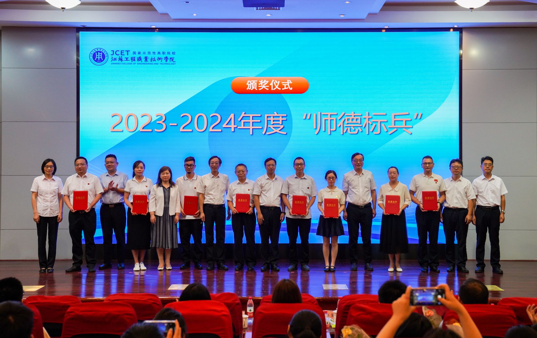 党委副书记、校长张忠宣读《关于给凌建军等同志颁发三十年教龄荣誉证书的决定》《关于表彰江苏工程职业技术学院2023-2024学年“师德标兵”的决定》《2024年上半年省级以上荣誉及竞赛获奖者名单》。秦志林、张忠为凌建军、熊晓霞、王玉兰等三位老师颁发三十年教龄荣誉证书。全体校领导为2023-2024学年“师德标兵”、2024年省级以上荣誉及竞赛获奖教师颁发荣誉证书。师德标兵、航空与交通工程学院浦振托,纺织服装学院博士朱志杰作为教师代表上台发言。部分辅导员、经济管理学院吴澄艳老师分别演唱《还是很幸福》《老师,我想你》,用歌声表达对教育事业的热爱和对美好生活的向往。