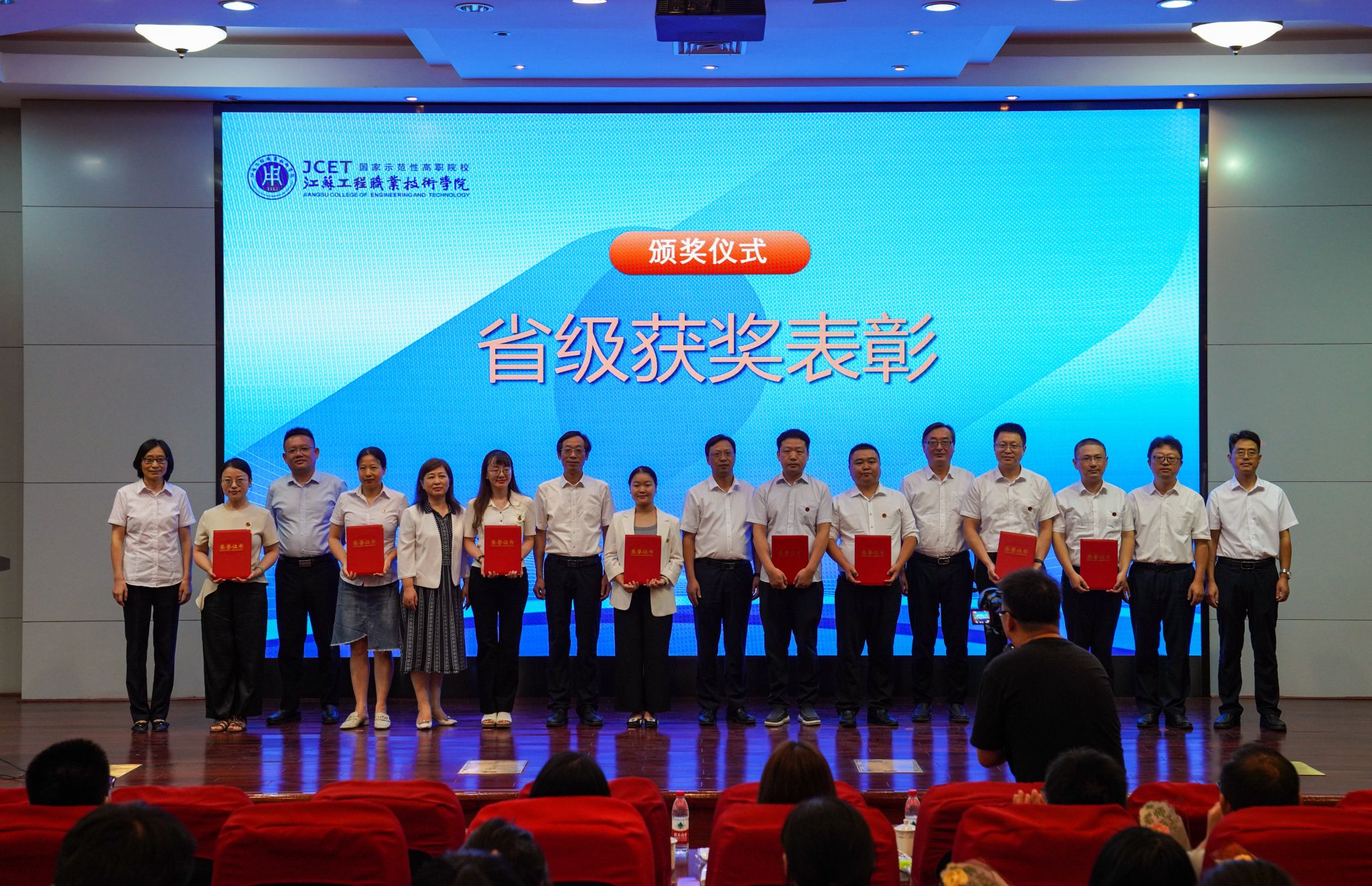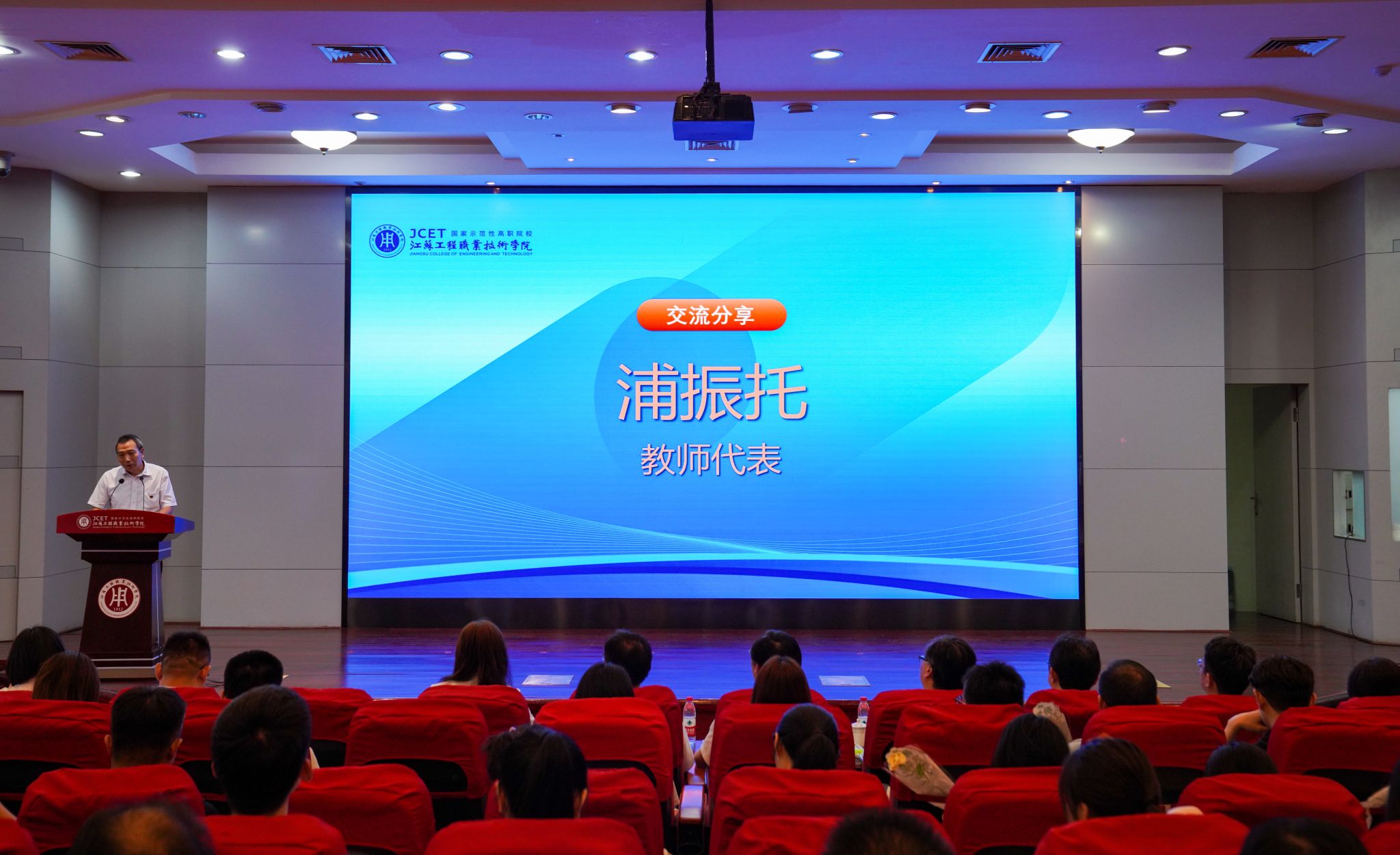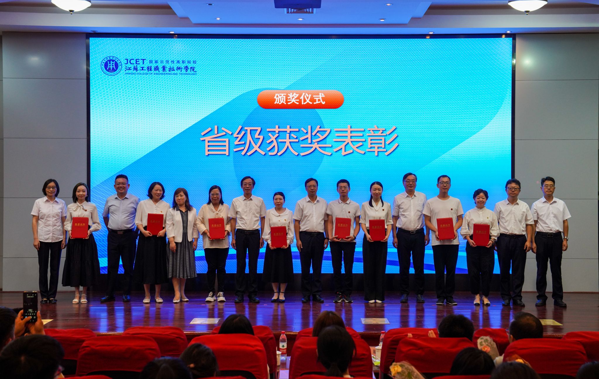 党委副书记、校长张忠宣读《关于给凌建军等同志颁发三十年教龄荣誉证书的决定》《关于表彰江苏工程职业技术学院2023-2024学年“师德标兵”的决定》《2024年上半年省级以上荣誉及竞赛获奖者名单》。秦志林、张忠为凌建军、熊晓霞、王玉兰等三位老师颁发三十年教龄荣誉证书。全体校领导为2023-2024学年“师德标兵”、2024年省级以上荣誉及竞赛获奖教师颁发荣誉证书。师德标兵、航空与交通工程学院浦振托,纺织服装学院博士朱志杰作为教师代表上台发言。部分辅导员、经济管理学院吴澄艳老师分别演唱《还是很幸福》《老师,我想你》,用歌声表达对教育事业的热爱和对美好生活的向往。
