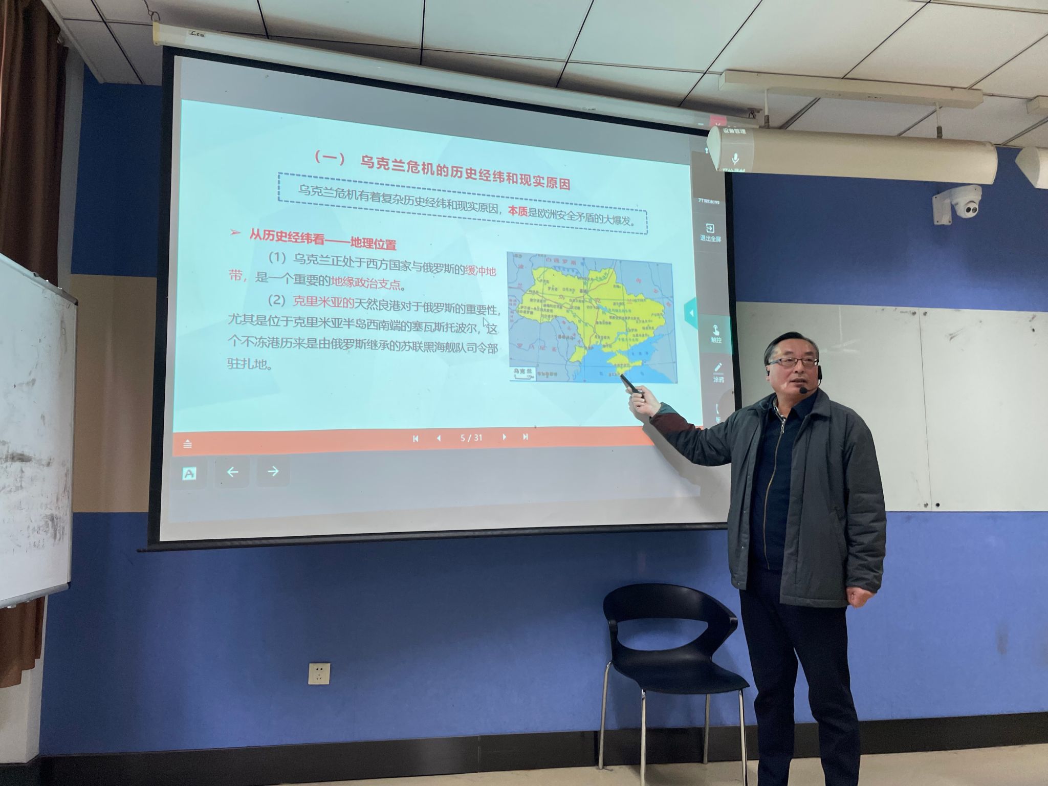 课上,邓海龙分析了我国周边及国际地区热点问题,从中越、中印、中国-东盟关系的改善到当前中美关系演变、俄乌冲突和巴以冲突等对当下国际政治环境作了全面介绍。在讲授乌克兰危机问题时,他从地理、历史、宗教文化等因素深入剖析了危机产生的历史经纬,从北约、欧盟等多方的态度分析危机加剧的现实原因,结合实例总结危机带来的深刻影响。在讲解中方的立场时,他引导学生从“两个一百年”的视角看待中国在国际交往中的作为,深刻领悟“三大全球倡议”和“人类命运共同体”等习近平外交思想的具体实践。邓海龙的授课视野广阔、内容详实、论述严谨,课堂气氛活跃。