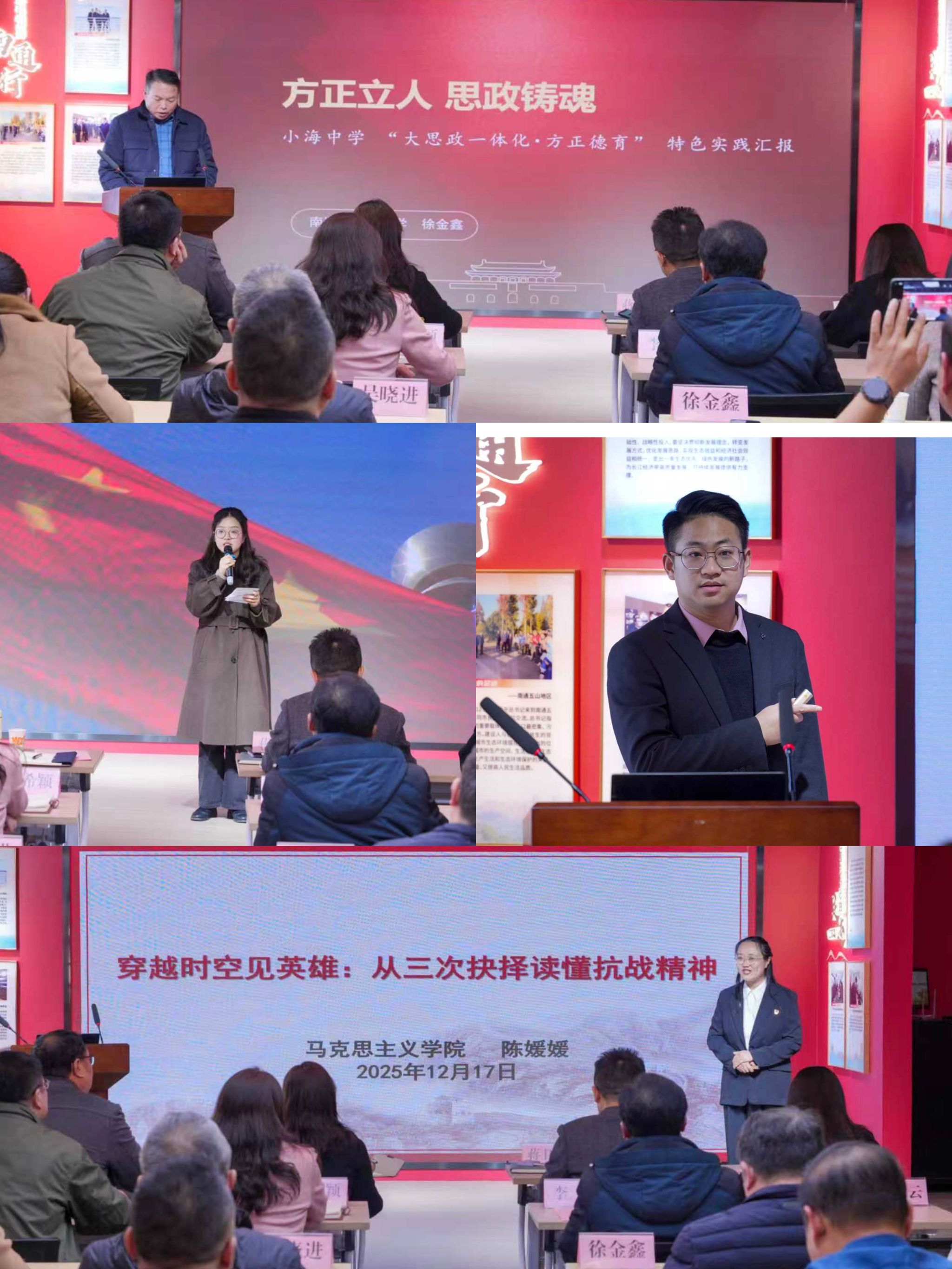 分学段主题展示环节中,南通市天生港小学张冰倩带来理论微宣讲《山河铭记 薪火永传》、江苏省南通中等专业学校吴君垚作无生展示《永不消逝的号声》、南通市小海中学副校长徐金鑫作《方正立人 思政铸魂 小海中学 “大思政一体化・方正德育” 特色实践汇报》、我校马克思主义学院副院长陈媛媛带来思政微课《穿越时空见英雄:从三次抉择读懂抗战精神》,分别围绕不同学段学生成长特点,展示了思政育人的创新实践。