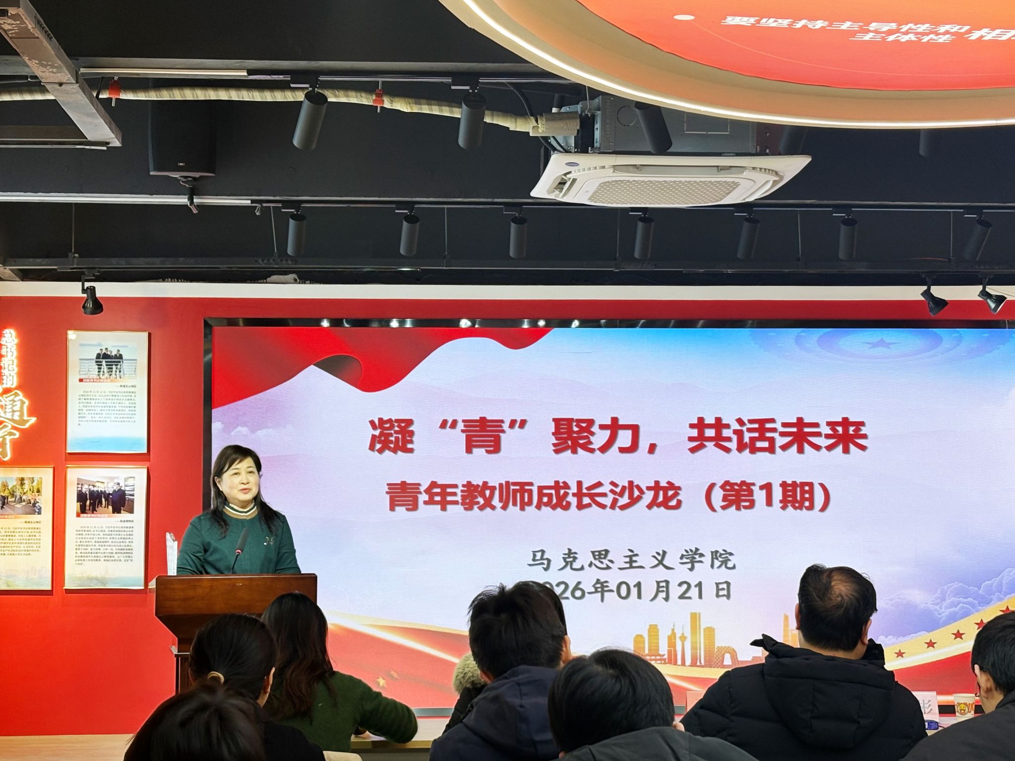 为深入学习贯彻党的二十届四中全会精神和全国教育大会精神,加强师德师风建设,弘扬教育家精神,助力青年教师成长,近日,马克思主义学院举办“凝‘青’聚力,共话未来”青年教师成长沙龙。校党委副书记丛彬彬,校党委委员、副校长尹桂波,校产教融合处处长程莉,学工部副部长刘宇,江苏省辅导员年度人物、纺织服装学院党总支副书记周星星出席活动。马克思主义学院党政班子、七个二级学院结对辅导员及马院全体青年教师共同参与。活动由学院副院长陈媛媛主持。