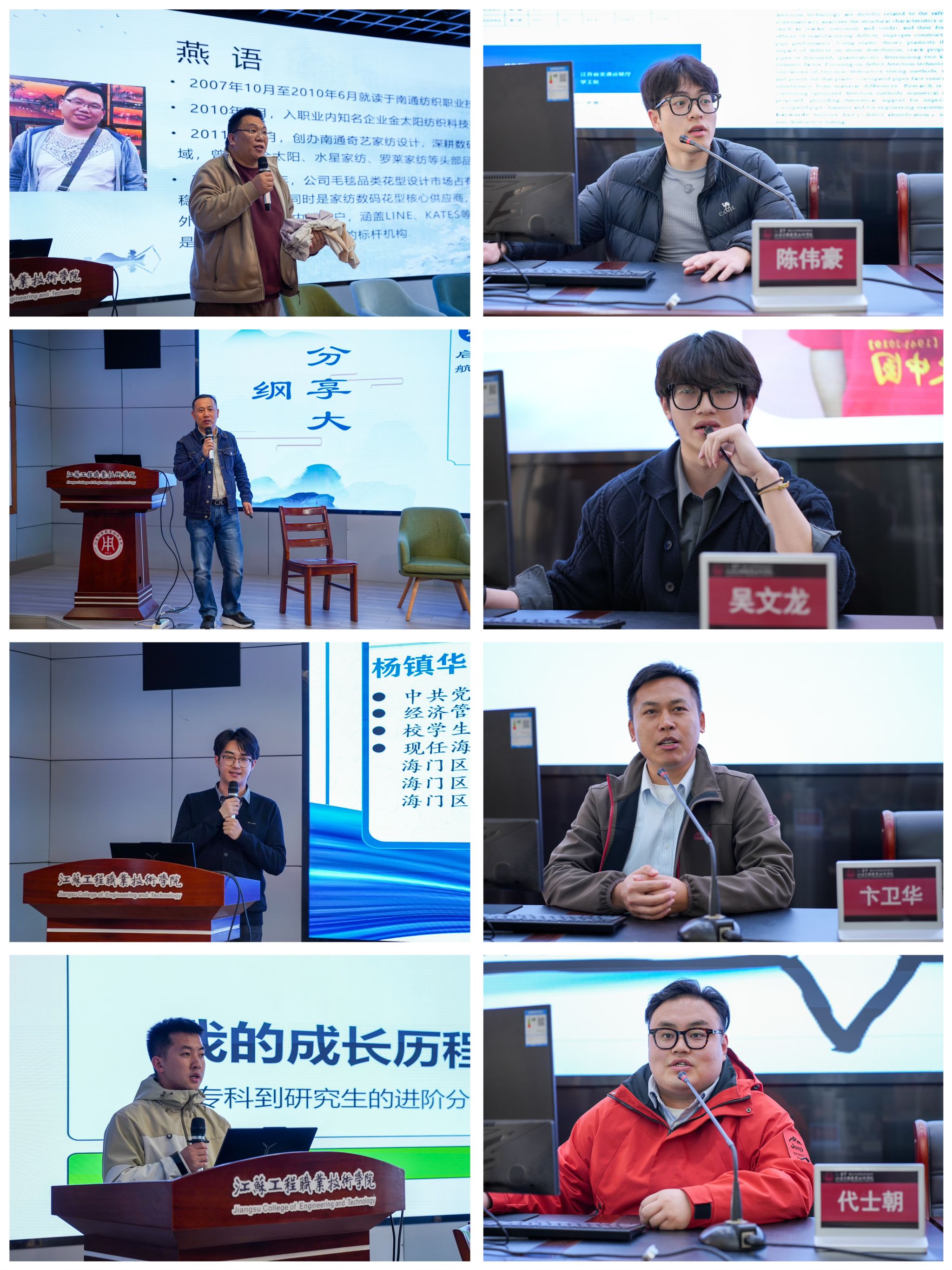 八位优秀校友重返母校,结合自身在不同领域的发展历程,分享成长故事、畅谈人生感悟,为在校学子送上了极具价值的经验参考。2010届校友燕语深耕专业领域多年,他结合自身行业积淀,强调“专注与坚持”是突破职业发展瓶颈、实现自我提升的核心关键;2006届校友刘金华、2007届校友卞卫华以创业成功者的身份,讲述了自己“敢想敢闯、勇于尝试”的创业历程,激励工院学子大胆拥抱未来的不确定性,勇敢追逐梦想;2023届校友杨镇华作为定向委培“大学生村干部”,讲述了在乡村振兴中的贡献与收获;2024届校友陈伟豪、孙玉猛分享了自己备考本科和研究生的经历,传递了深耕学业、奋勇争先的信念。此外,2021届校友吴文龙、2025届校友代士朝立足基层岗位实践,分享了自己的工作感悟,直言“脚踏实地是成长的根基”,用实际行动展现了平凡岗位上的不凡坚守与追求。