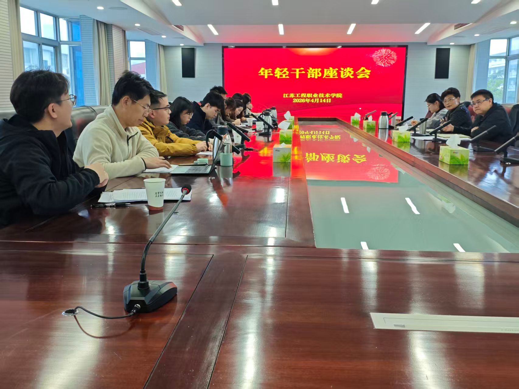 4月14日上午,党委组织部在行政楼第一会议室召开年轻干部座谈会。校党委书记钱锁梅,党委委员、组织部部长徐磊,组织部副部长吴颖及12名年轻干部代表参加会议。座谈会由徐磊主持。