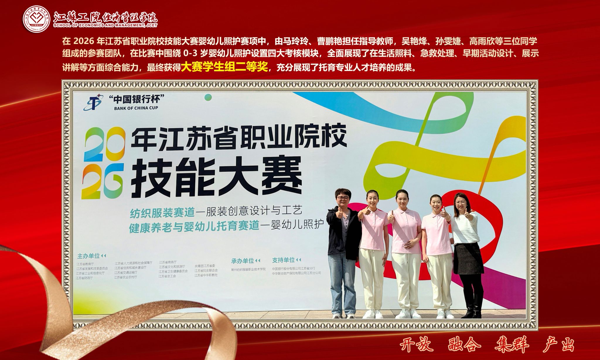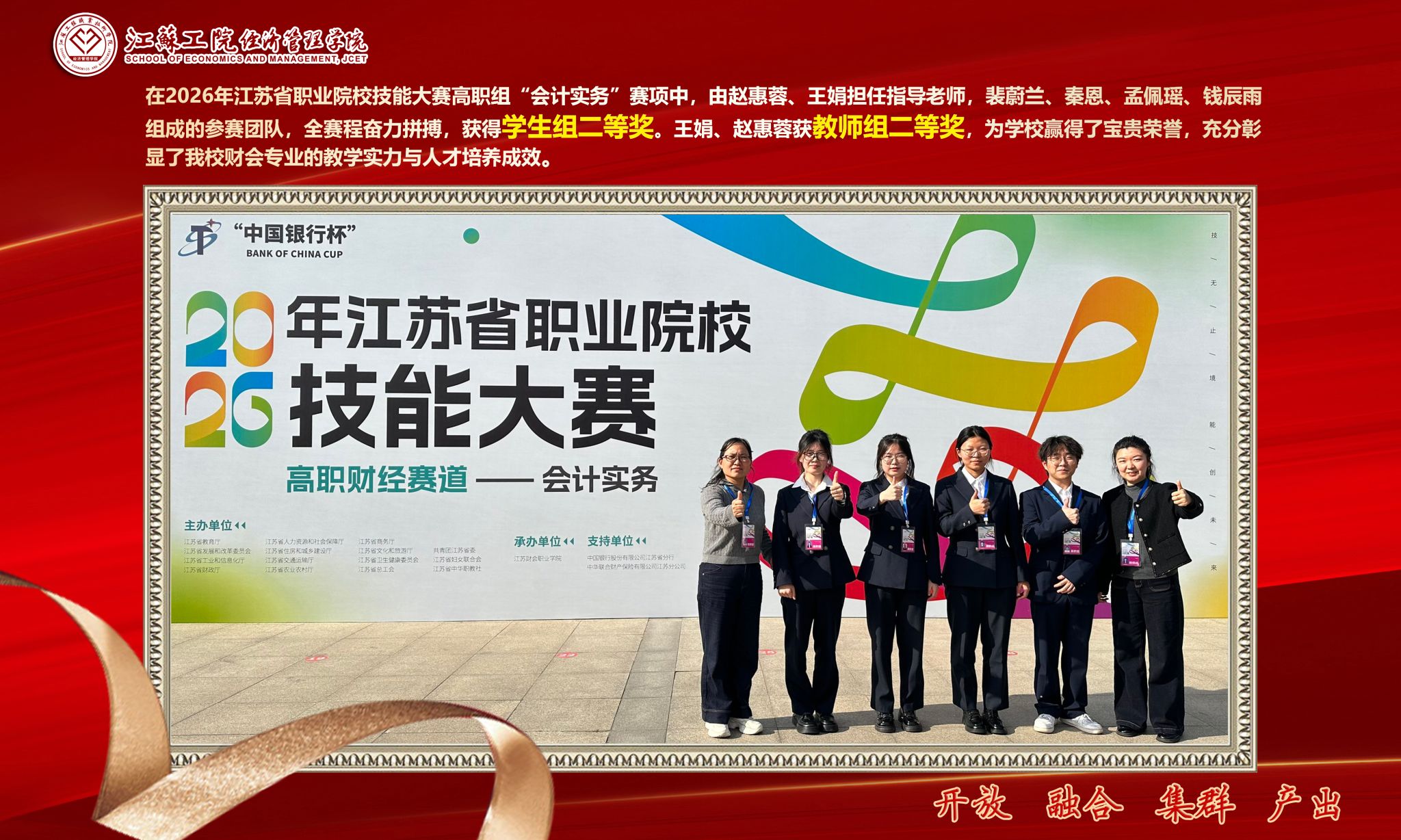 近日,经济管理学院在2026年江苏省职业院校技能大赛中再传佳讯。其中,由马玲玲、曹鹏艳担任指导教师,吴艳烽、孙雯婕、高雨欣等学生组成的团队,凭借扎实的专业技能、稳定的临场发挥和默契的团队协作,在“婴幼儿照护”赛项中获得二等奖。由王娟、赵惠蓉担任指导教师,裴蔚兰、秦恩、孟佩瑶、钱辰雨等学生组成的团队,从全省43支参赛队伍中脱颖而出,荣获“会计实务”学生组二等奖,王娟、赵惠蓉获该赛项教师组二等奖。