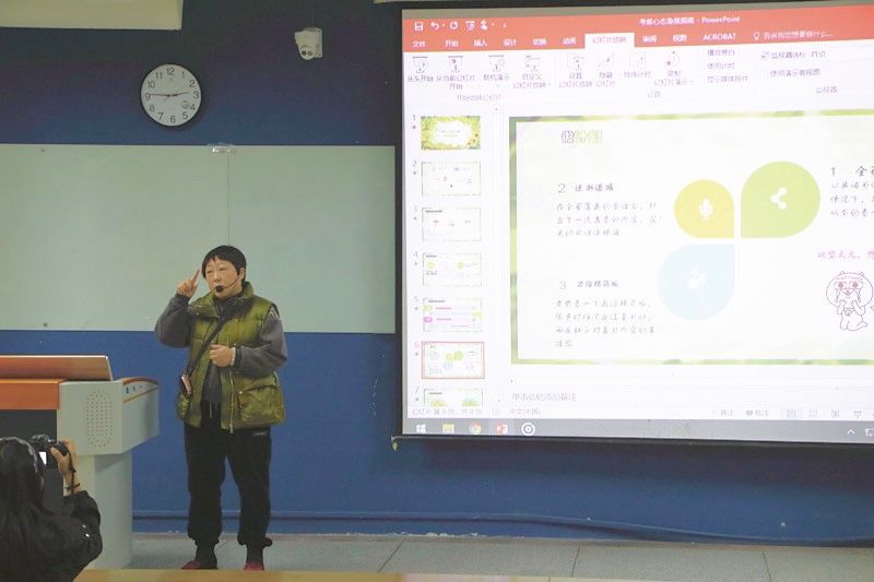 讲座中,王健首先从专业角度分析人的适应压力分三阶段“警觉”、“搏斗”、“衰竭”,指导学生通过睡眠指标,例如睡眠质量、睡后感等判断自己处于哪个阶段。随后,又利用压力曲线图讲解“压力=要什么÷凭什么”,每个人可以根据曲线图找到自己的压力绩效区。最后,王健结合个人心理特点向学生们给出了“考前四注意”、“复习三步走”、“临考三建议”。