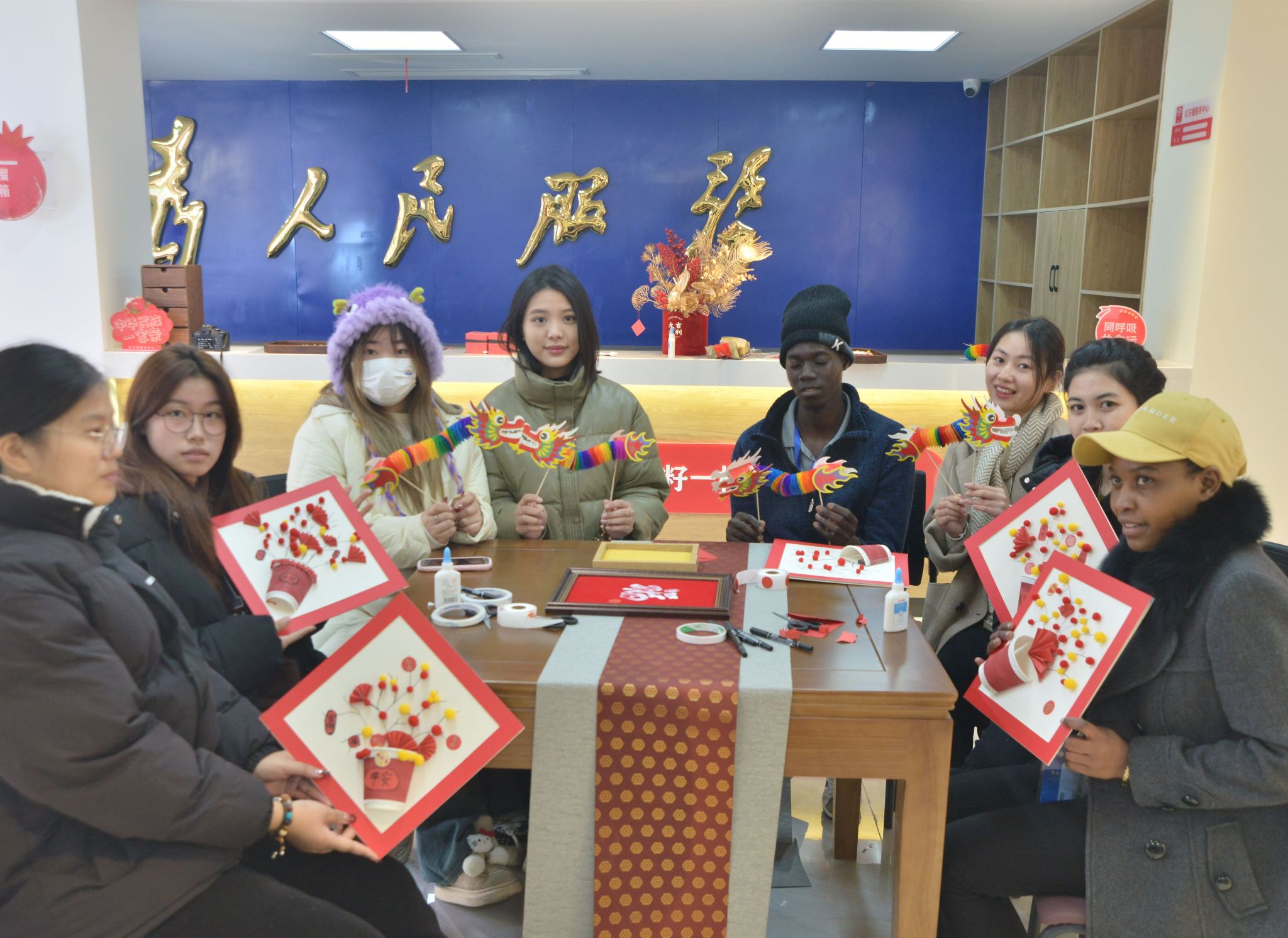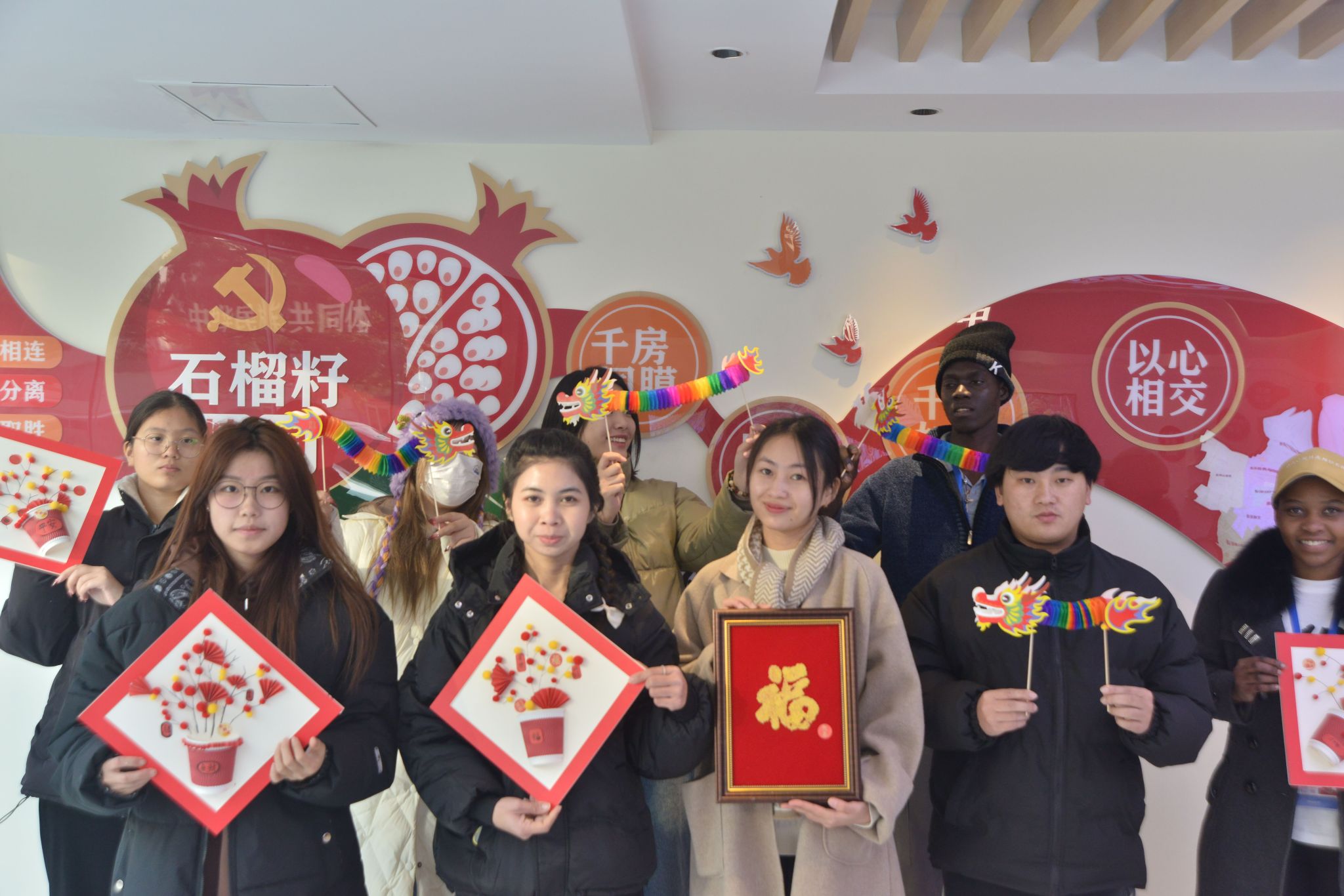 1月11日下午,纺织服装学院学生走进学田社区红石榴家园,与辖区新业态新就业群体、南通职业大学留学生一起制作生肖龙、年宵花饰品,迎接即将来临的龙年,感受中国传统文化的魅力。