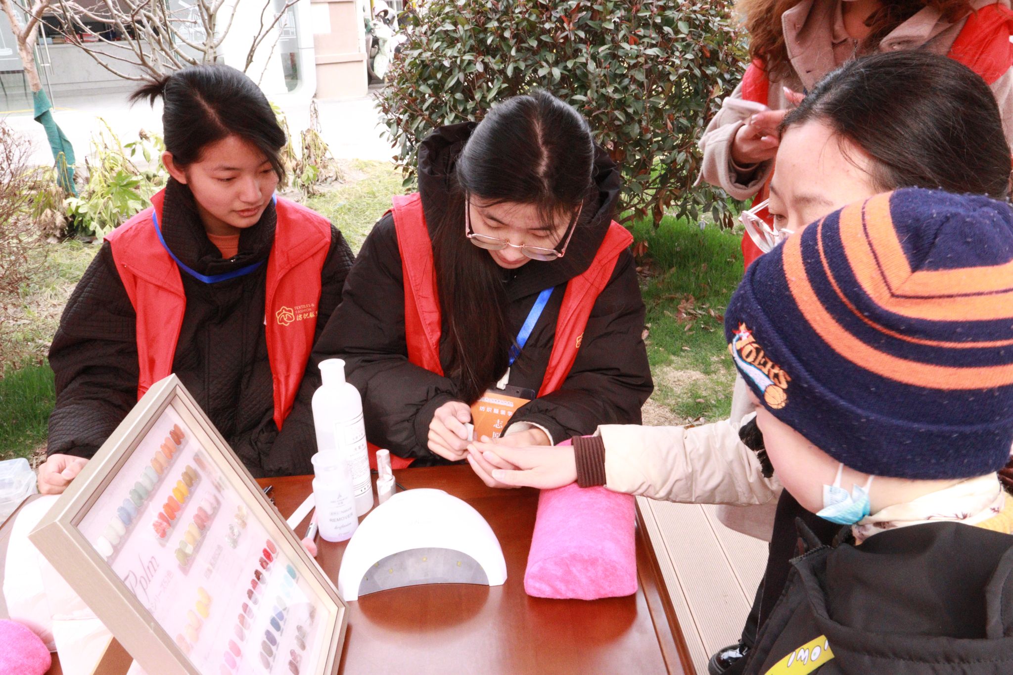 参与本次志愿服务的同学来自学院手工编织社团团支部、美妆美甲社团团支部、大手拉小手志愿服务社团团支部。他们运用自己所学的化妆品技术、手工编织技能为社区居民提供家居物件编织、手部护理、美甲等志愿服务。现场前来观摩、体验的居民络绎不绝,学生的专业能力和志愿服务精神得到了学田社区居民的高度认可。