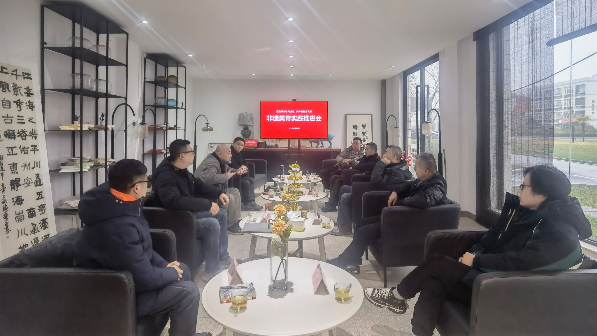 张盼对数字时尚与非遗延展设计研究院的建设背景、建设思路和工作要点进行了汇报;王刚对数字时尚与非遗延展设计研究院的改造方案进行了分享,对研究院非遗美育陈列馆的空间布局、工艺实施、材料选用等方面进行了介绍;丁健分享了南通非遗石港窨糕的创新设计思路;祝峻分享了江苏瀚港文化发展有限公司在非遗文创开发方面的成功案例和推广经验。