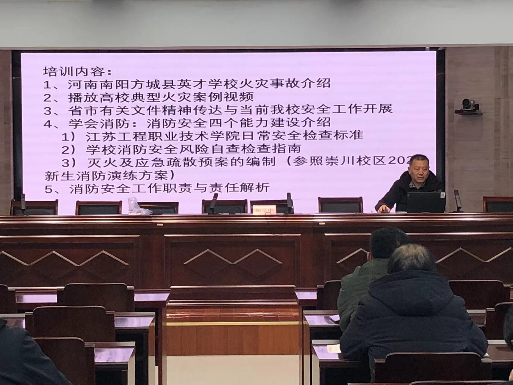 安全保卫处吴军分别从省市有关文件精神传达、消防安全四个能力建设、消防安全工作职责与责任解析等五个方面作消防讲座。江苏方兴信息技术科技有限公司的工程师进行了电动自行车安全管理软件系统培训。