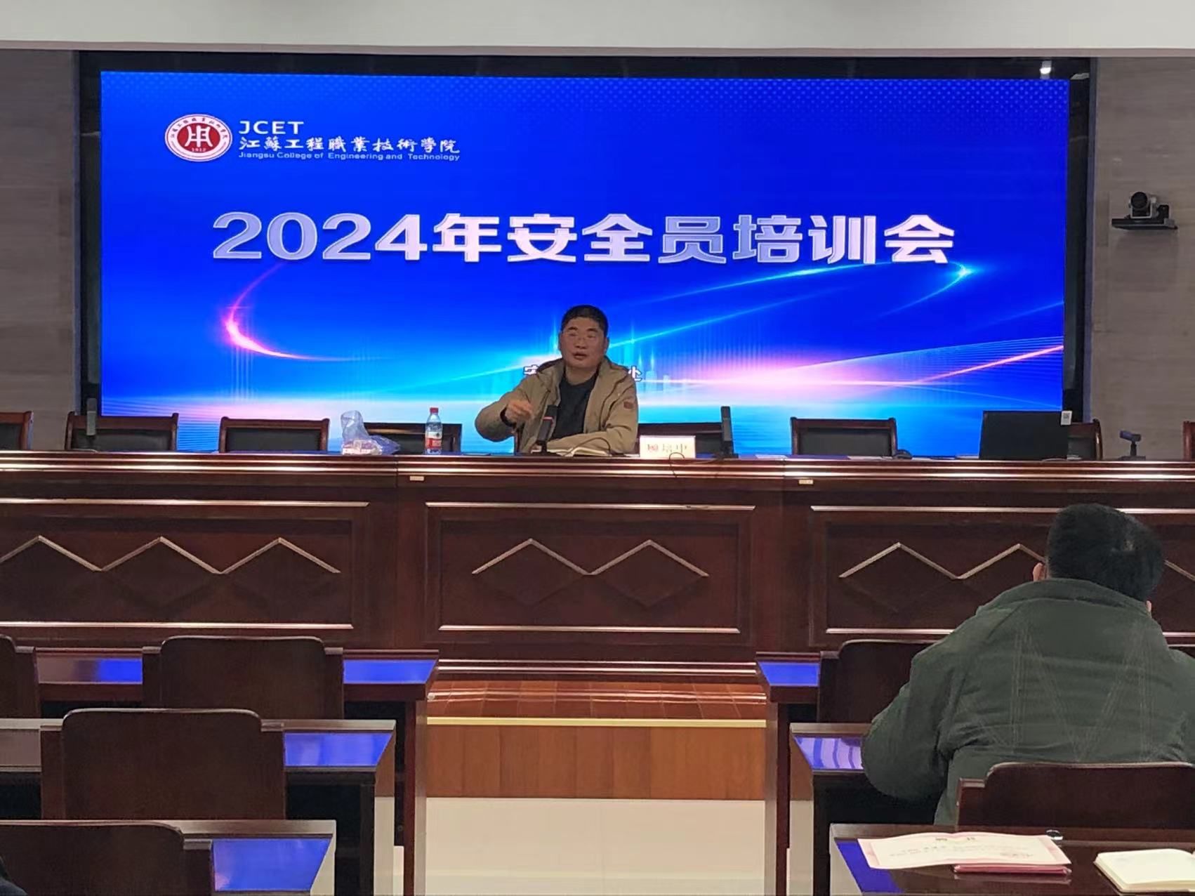 顾培中通过江西新余、河南南阳、江苏南京火灾案例,结合学校存在的安全风险隐患分析了我校安全现状及存在问题,重点解读了江苏工程职业技术学院安全员工作职责,领学了《江苏工程职业技术学院常规日常安全检查标准》,要求全体安全员要提高认识,落实安全责任;强化教育,提高安全意识;突出重点,消除安全隐患。顾培中就做好2024年校园安全稳定工作,作了全面动员。