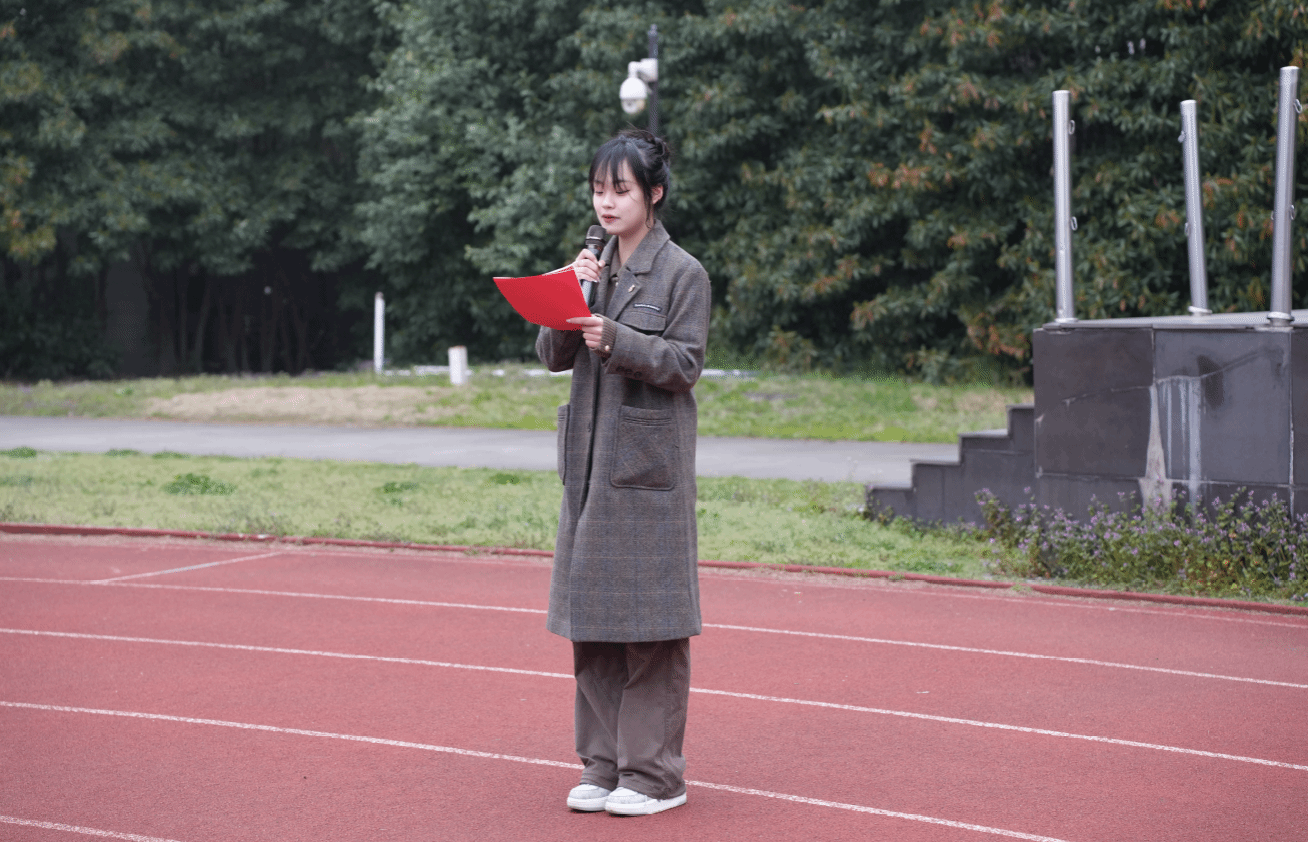 7点整,国旗护卫队的旗手们着装整齐,迈着矫健的步伐来到国旗台下。在慷慨激昂、铿锵有力的《国歌》声中,升旗手振臂一挥,鲜艳的五星红旗徐徐展开,在阳光映照下及全体师生的注目礼中,迎着初升的太阳,在晨曦中迎风飘扬在学校上空。学生代表杨雅雯作题为《志愿之光耀工院 雷锋精神续新篇》的国旗下演讲,号召同学们要践行和弘扬雷锋精神,发扬“奉献、友爱、互助、进步”的志愿服务精神,推进校园文明建设,做优良学风的践行者和文明校园的领头者。