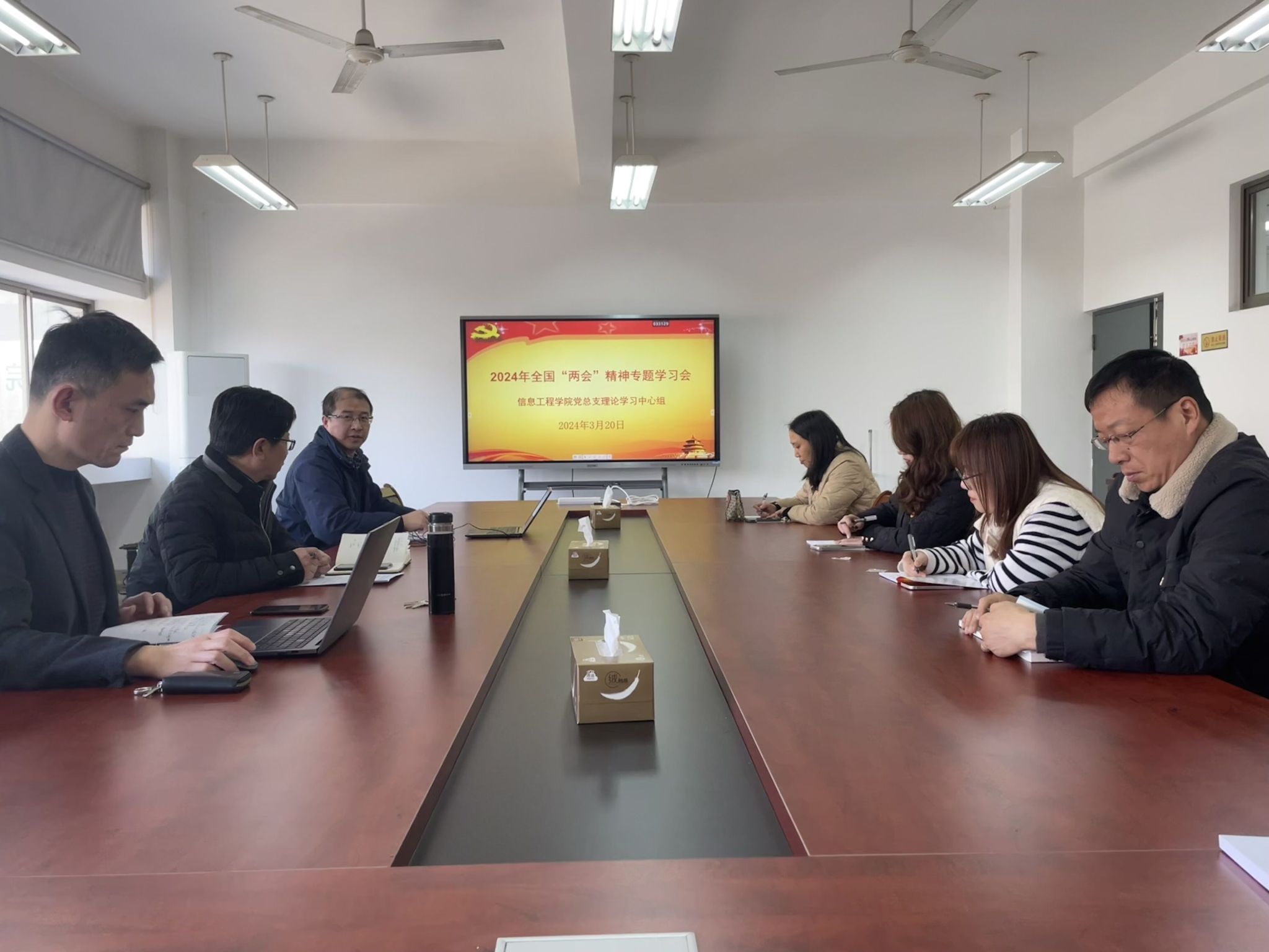 3月20日,信息工程学院党总支理论学习中心组在强毅楼304会议室召开2024年全国两会精神专题学习会,学院党总支书记朱建泉主持会议。