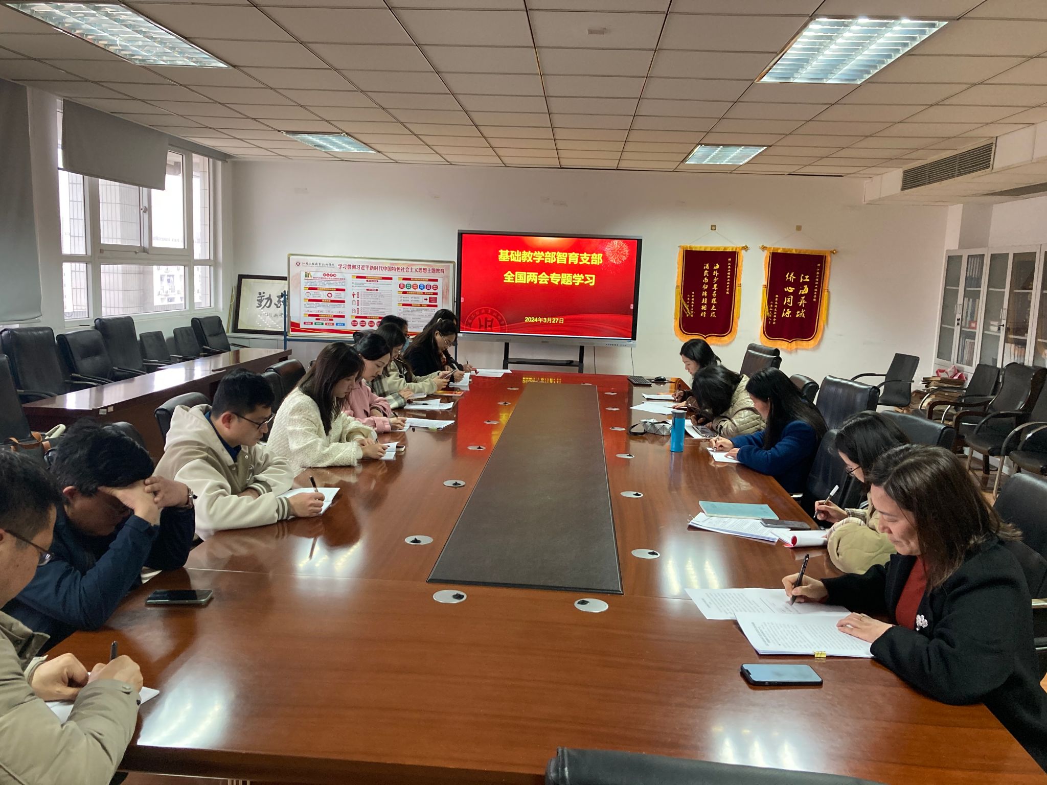 3月20日上午、27日下午,基础教学部分别通过支部主题党日活动和部门教职工政治学习活动开展了全国两会精神学习研讨活动。