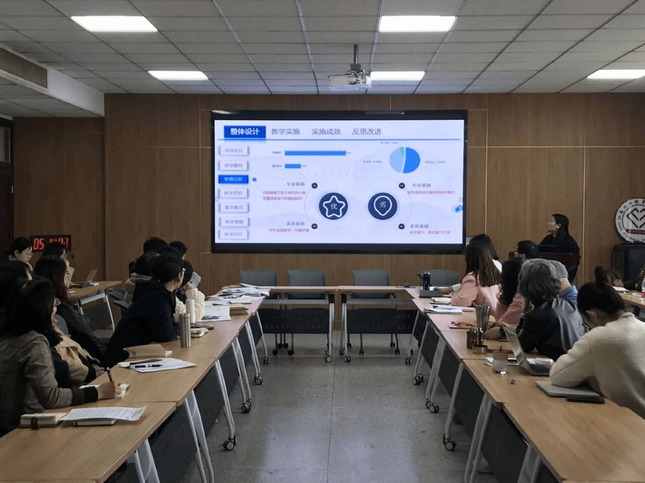 在前期预赛的基础上,学院选出四份优秀教案,由课程负责人自行组队,形成四个教学团队。本次教学能力展示活动,四个团队除需提交作品电子档,包括实施报告、人才培养方案、课程标准和教材。王锦梅、赵惠蓉、杨帆、赵静宜等四位教师分别从教学设计、教学实施、学习效果、特色创新及反思改进等方面对参赛作品进行汇报。教师们教态自然,吐字清晰,声音洪亮,概念表述准确,教学内容安排合理、连贯。