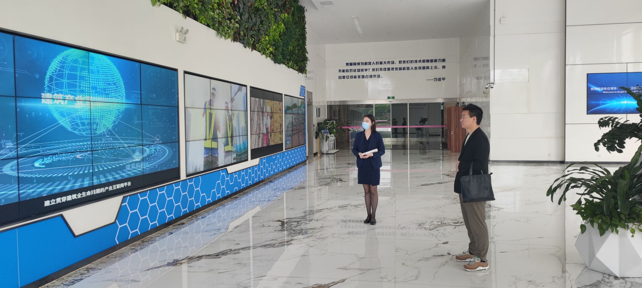 在博智林科创大楼展厅,博智林现场负责人带领王斯海来到建筑机器人工地,参观了多种建筑机器人现场作业情况,并介绍了公司发展、行业新风口、传统建筑业智能化发展趋势等情况。