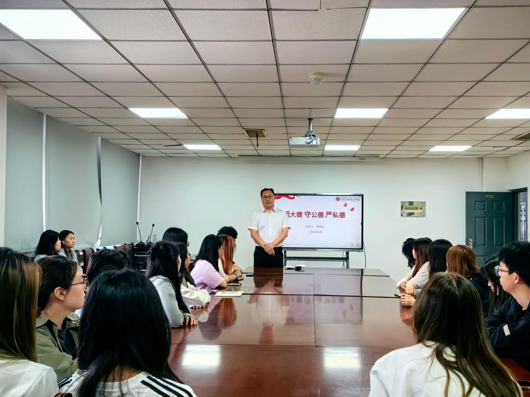 5月29日,纺织服装学院在强毅楼604开展了一堂主题为“明大德,守公德,严私德”的思政课。本次思政课由纺织服装学院院长尹桂波主讲,30余名23级优秀学生干部代表参加了本次思政课的学习。