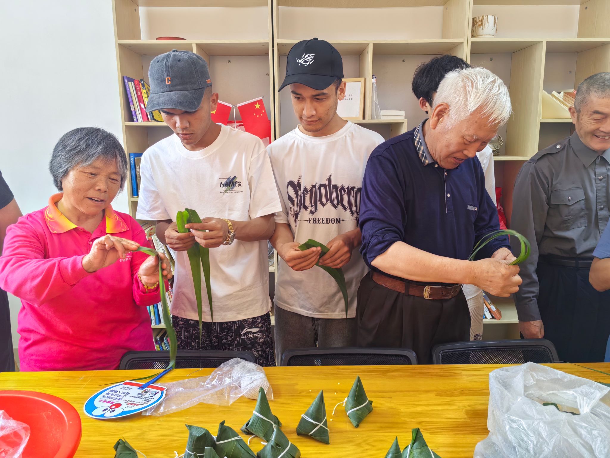现场人员集体观看了宋朝汉服微视频,感受避五毒、插五端、挂香囊、配长命缕等习俗,梦回千年前的时光,感受中华民族端午民俗的源远流长。“书香人生 阅见千禧”阅读推广人和艺术设计学院张晓霞老师跟大家一起诵读楚辞《云中君》,走进诗人屈原的楚辞世界,感受西楚文化。艺术设计学院“艺彩”志愿服务团的少数民族学生跟着社区微网格员们一起动手学包粽子。阿姨们手把手耐心地教,同学们目不转睛认真地学,洗粽叶、拌粽馅、折叠粽叶,三角粽、斧头粽、穿粽,形态各异的粽子,逐渐成形,摆满了桌面。寓教于乐的包粽子活动,让少数民族学生体验“粽子”这一传统节日食物的制作过程,在劳动过程中“粽”享欢乐,感受传统佳节的温馨气氛和独特魅力。