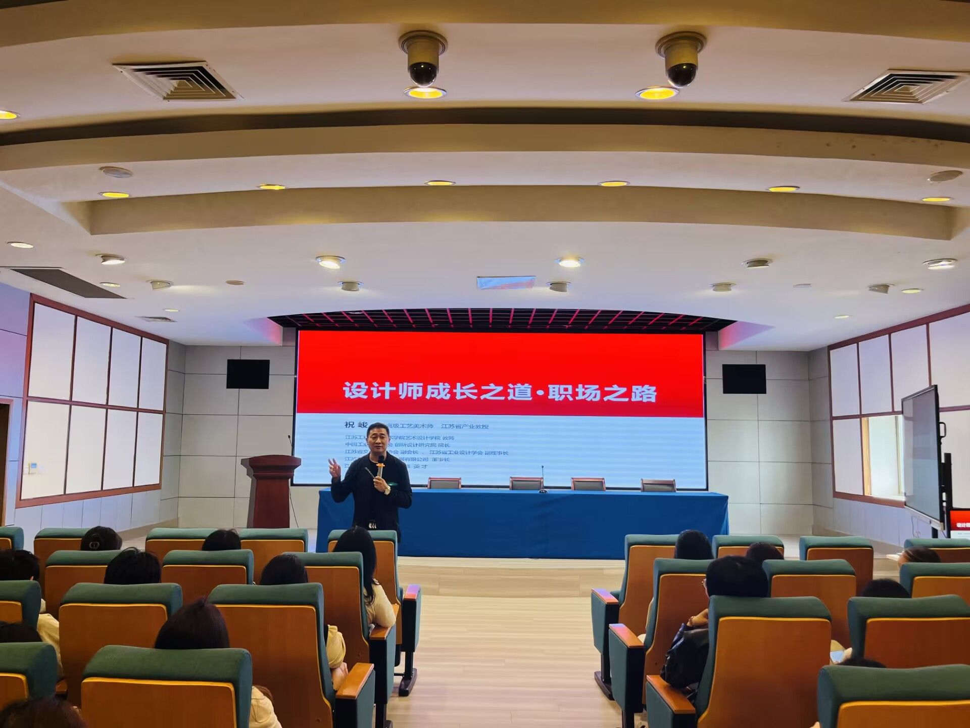 为引导在校大学生明确个人发展目标,切实提高职业技能水平,6月5日下午,艺术设计学院、纺织服装学院在强毅楼演播厅开展职业生涯规划与就业指导讲座。正高级工艺美术师、江苏省产业教授祝峻应邀为同学们带来“设计师成长之道·职场之路”主题讲座。艺术设计学院党总支副书记赵喜恒、艺术设计学院和纺织服装学院2023级设计类专业学生参加了讲座。
