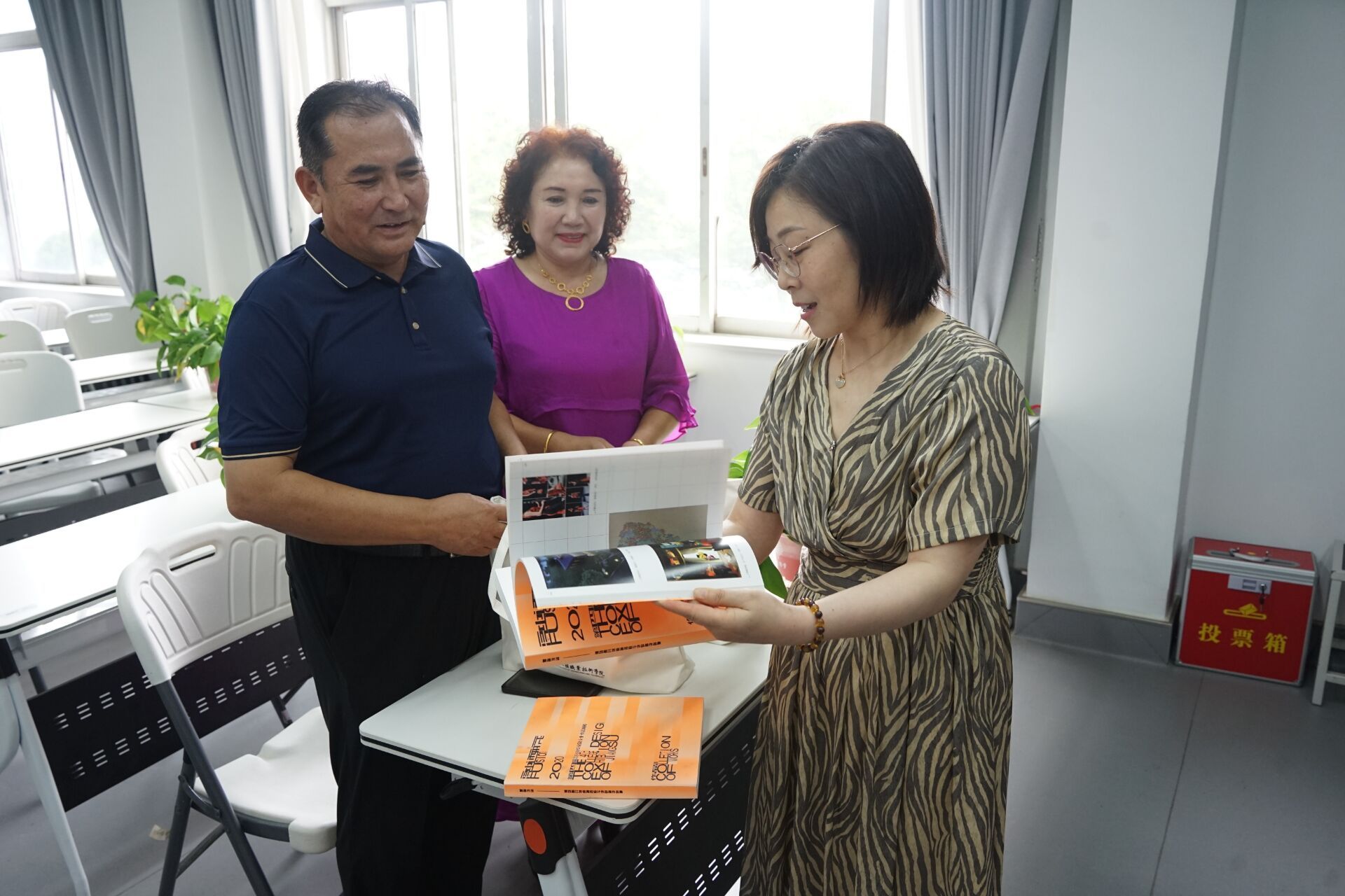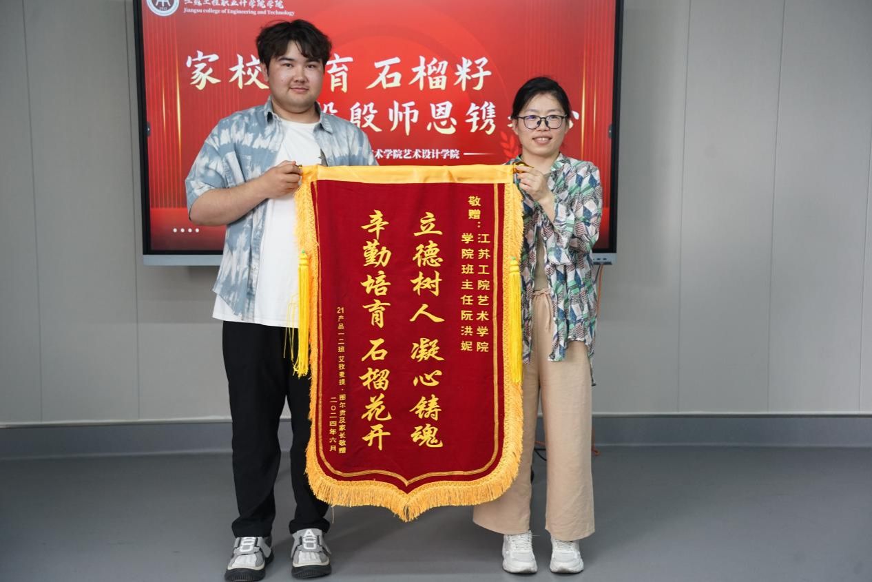 彭曼在致辞中对艾艾孜麦提•图尔贡的成长表示了由衷的喜悦,并对其父母的支持和理解表示了深深的感谢。仪式上,艾孜麦提•图尔贡及其父母向学院领导和班主任阮洪妮赠送了一面写有“立德树人凝心聚魂,辛勤培育石榴花开”的锦旗,表达了他们对学院和班主任老师的深深敬意与感激之情。作为回馈,彭曼代表学院向艾孜麦提•图尔贡的父母赠送了学院毕业设计作品画册和老师精心设计的手绘礼品。艾孜麦提•图尔贡表示,是老师们的悉心教诲和学院的良好环境,让他从一个对产品设计一知半解的学生成长为一名专业技能扎实、充满创新思维的毕业生。他将永远怀念在学院的美好时光,将所学所得用于实践,为家乡的文化艺术事业贡献自己的力量。