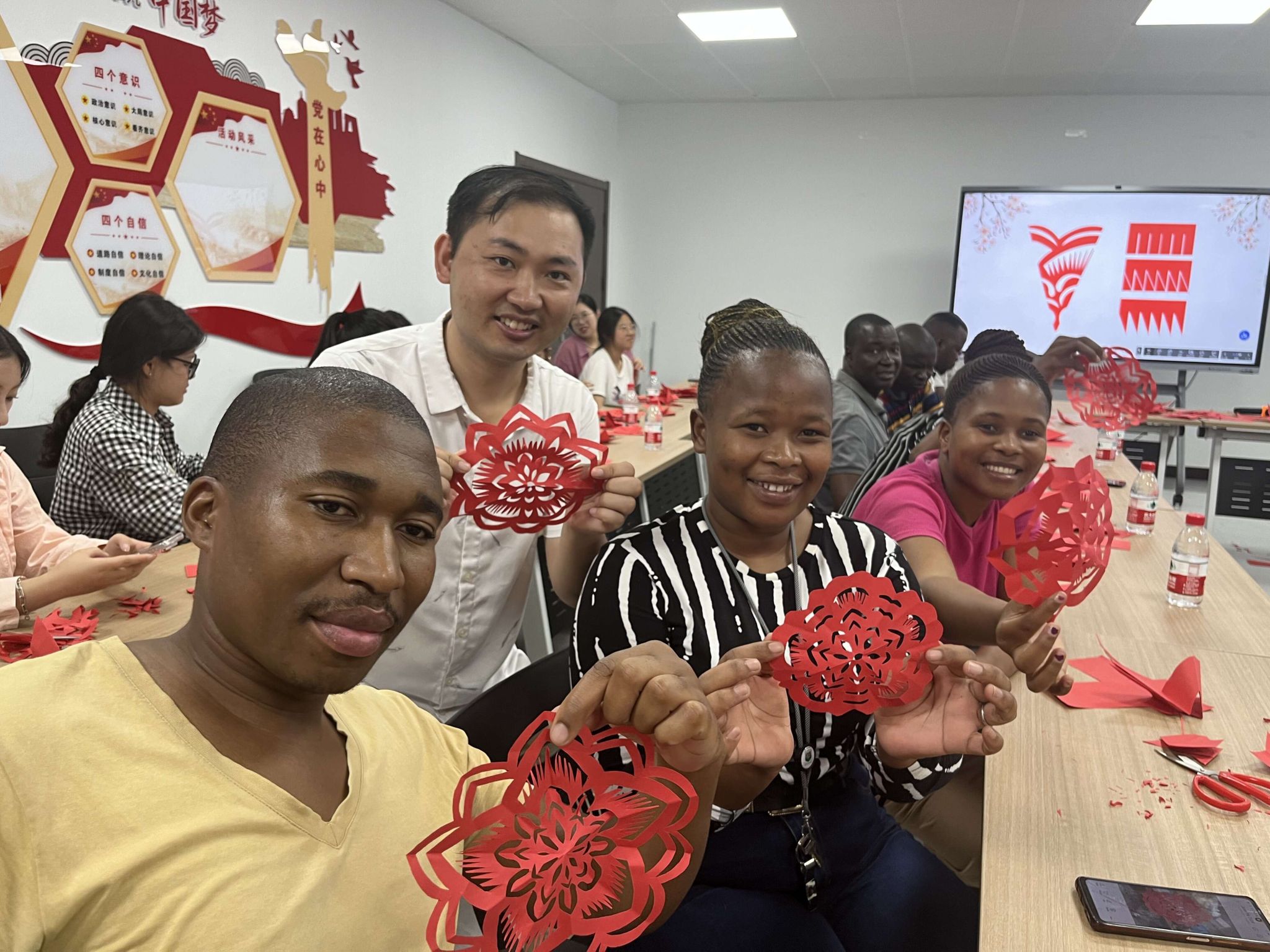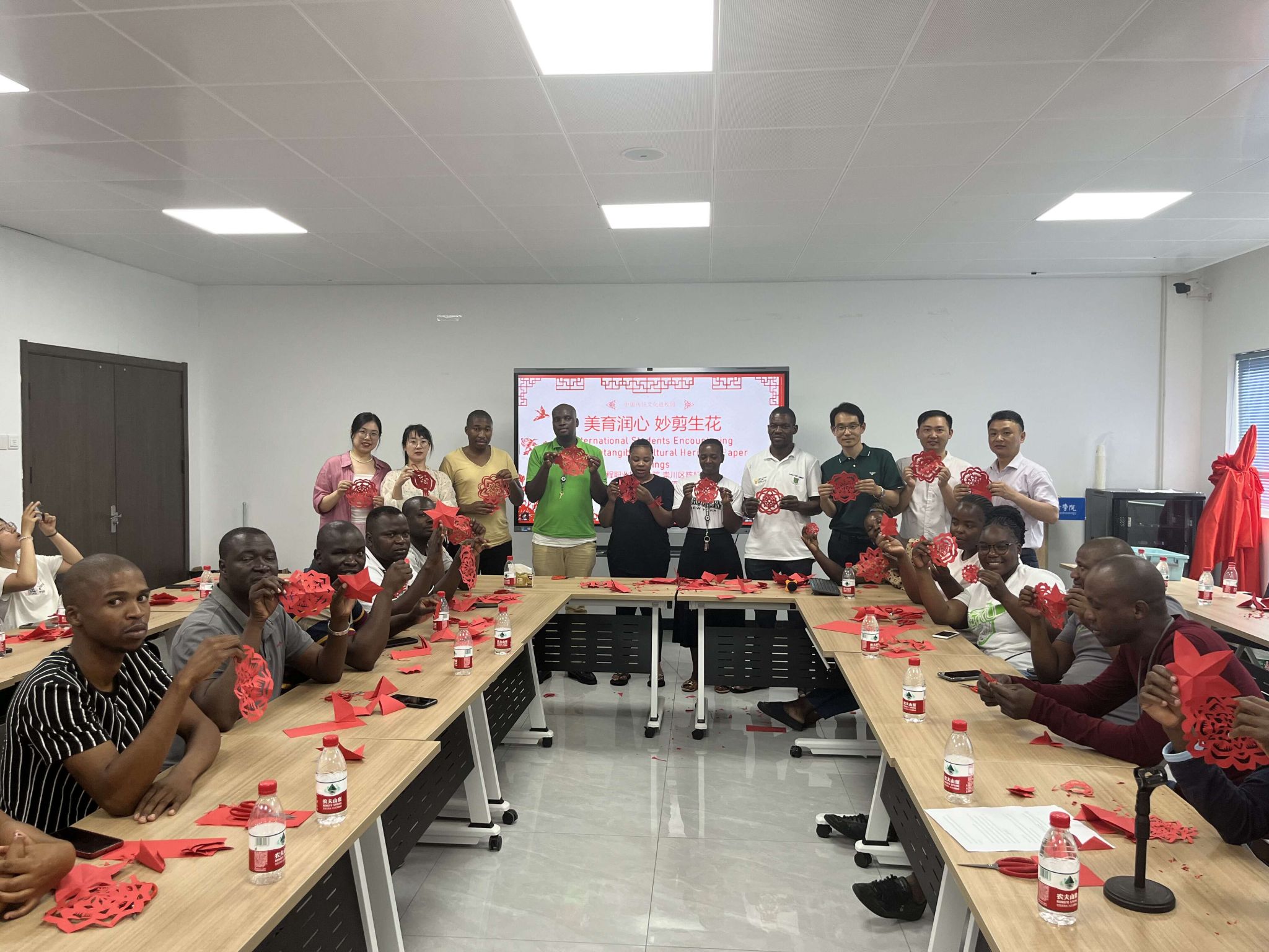 张忠肯定了我校在构建“五育并举”“三全育人”工作中,通过激发非遗等传统文化的美育活力,深入开展中华优秀传统文化系列活动,将美育融入中华优秀传统文化教育各环节,全面提升了学生文化理解、审美感知、创新实践等核心素养。李海烽介绍了剪纸的历史渊源和文化内涵,并展示了他优秀的剪纸作品。李海烽老师边讲边剪,手把手地教学,剪刀起起落落,转眼间惟妙惟肖的窗花、“喜”字、灯笼等作品便呈现在大家眼前。同学们按照老师的方法,通过折、描、剪、刻等方式,经过一番精心裁剪,一幅幅惟妙惟肖的剪纸作品就完成了。南非留学生通过对中国剪纸技艺的学习,对中国传统文化赞叹不已,表示今后将会把在中国所学的知识带回南非,与同学和家人分享。