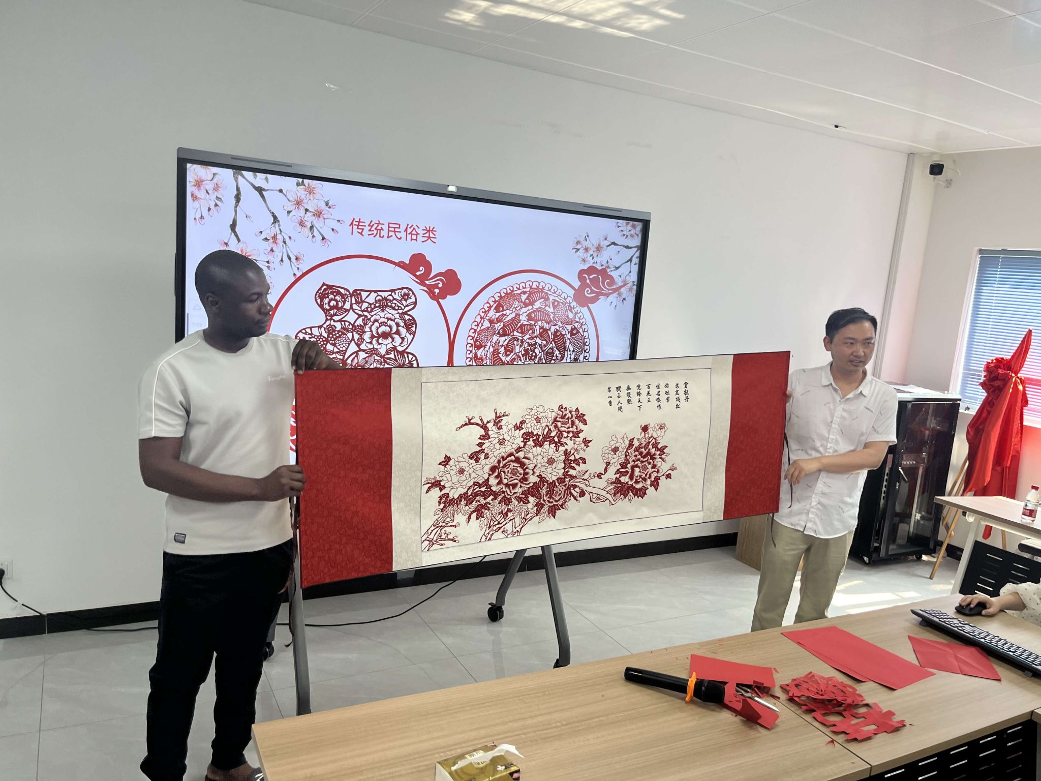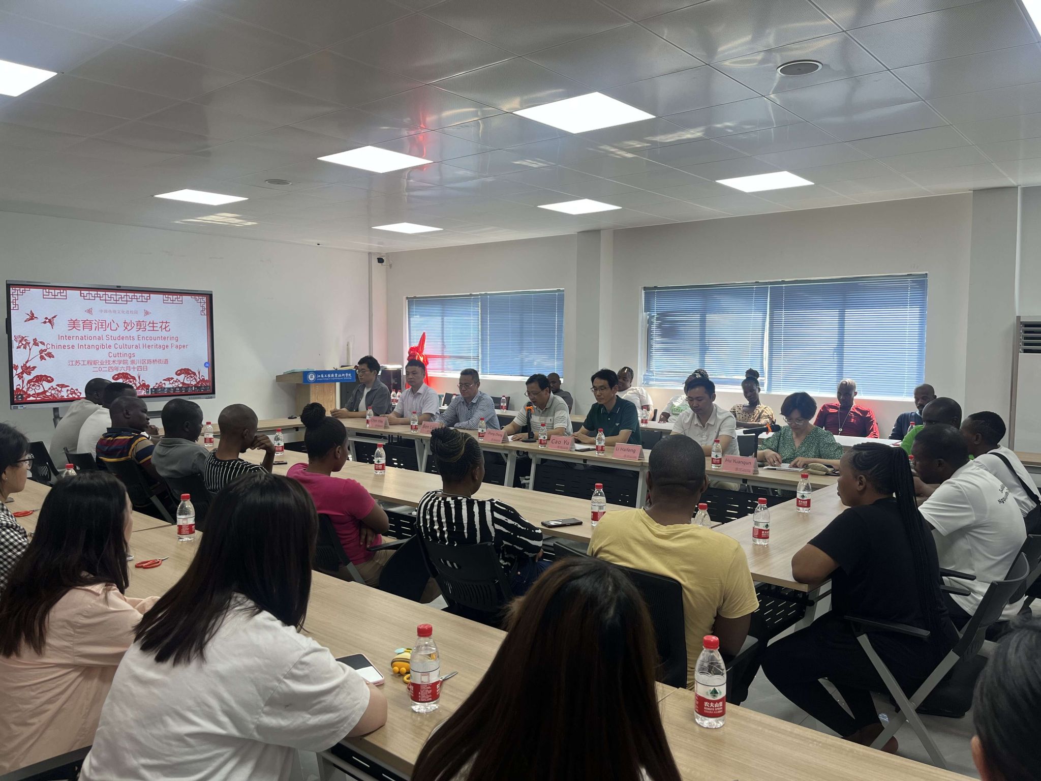 为进一步弘扬和传承中华民族传统文化,让学生感受非遗文化剪纸的独特艺术魅力,6月14日,我校联合崇川区陈桥街道在崇川校区一站式学生社区举办“美育润心 妙剪生花”——外国留学生邂逅中国非遗剪纸文化活动。校党委副书记、校长张忠、航空与交通工程学院党总支书记曹钰、院长贲礼进、党总支副书记陈益飞、商务教研室主任胡元群,中国非物质文化遗产南通剪纸艺术传承人李海烽、南非留学生及班主任共50余人参与此次活动。活动由曹钰主持。