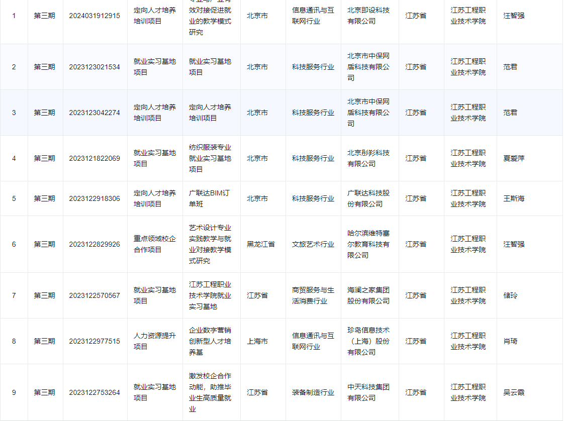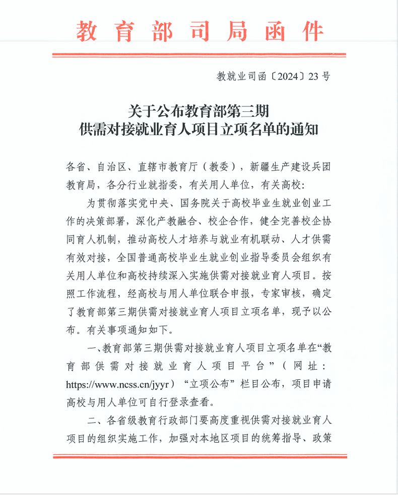 近日,教育部高校学生司公布《关于公布第三期供需对接就业育人项目立项名单的通知》,经联合申报、专家审核等环节,我校9项供需对接就业育人项目获批立项,其中重点领域校企合作项目1项、人力资源提升项目1项、定向人才培养项目3项、就业实习基地项目4项。