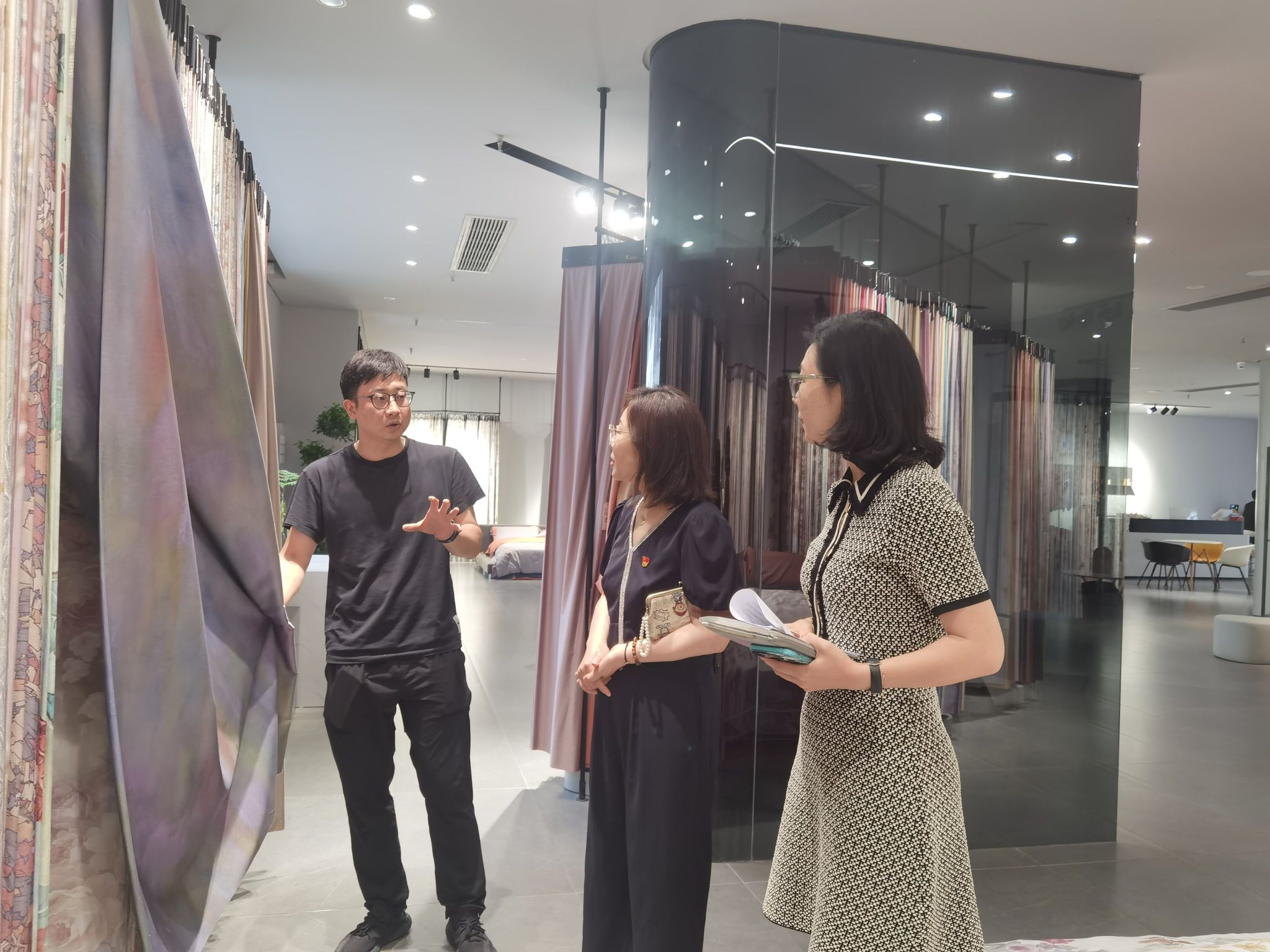 为进一步深化合作,充分发挥校地优势,共同致力于家纺产业高质量发展,6月20日,艺术设计学院党总支书记彭曼带队,产品艺术设计专业负责人管蓓莉,辅导员陈芳芳一行3人赴南通市通州区高端家纺产业链党委、南通国际家纺产业园区、南通市洣笙纺织科技有限公司走访调研。