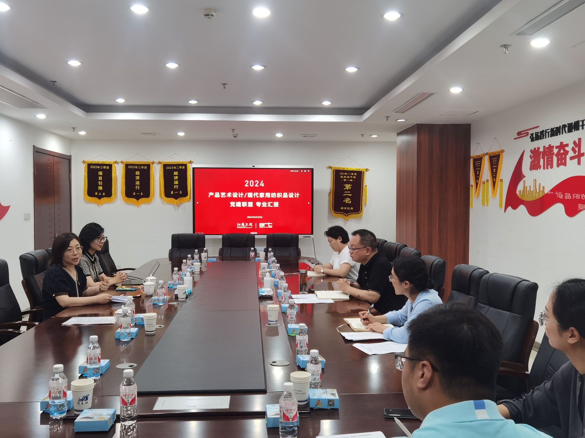 南通市通州区川姜镇党委副书记龚志军介绍了通州区高端家纺产业链党委的基本情况,高端家纺产业链党委由川姜镇党委牵头发起,成立于2022年7月,覆盖规上企业300余家,包括金太阳、蓝丝羽等非公企业32家,中国家用纺织品协会等协会商会5家。管蓓莉汇报了产品艺术设计、现代家用纺织品设计专业的历史沿革、特色和优势。彭曼代表艺术设计学院党总支,希望双方进一步开展产学研战略合作,对标区域经济发展和产业行业重点领域,加强交流合作,推动共同进步。