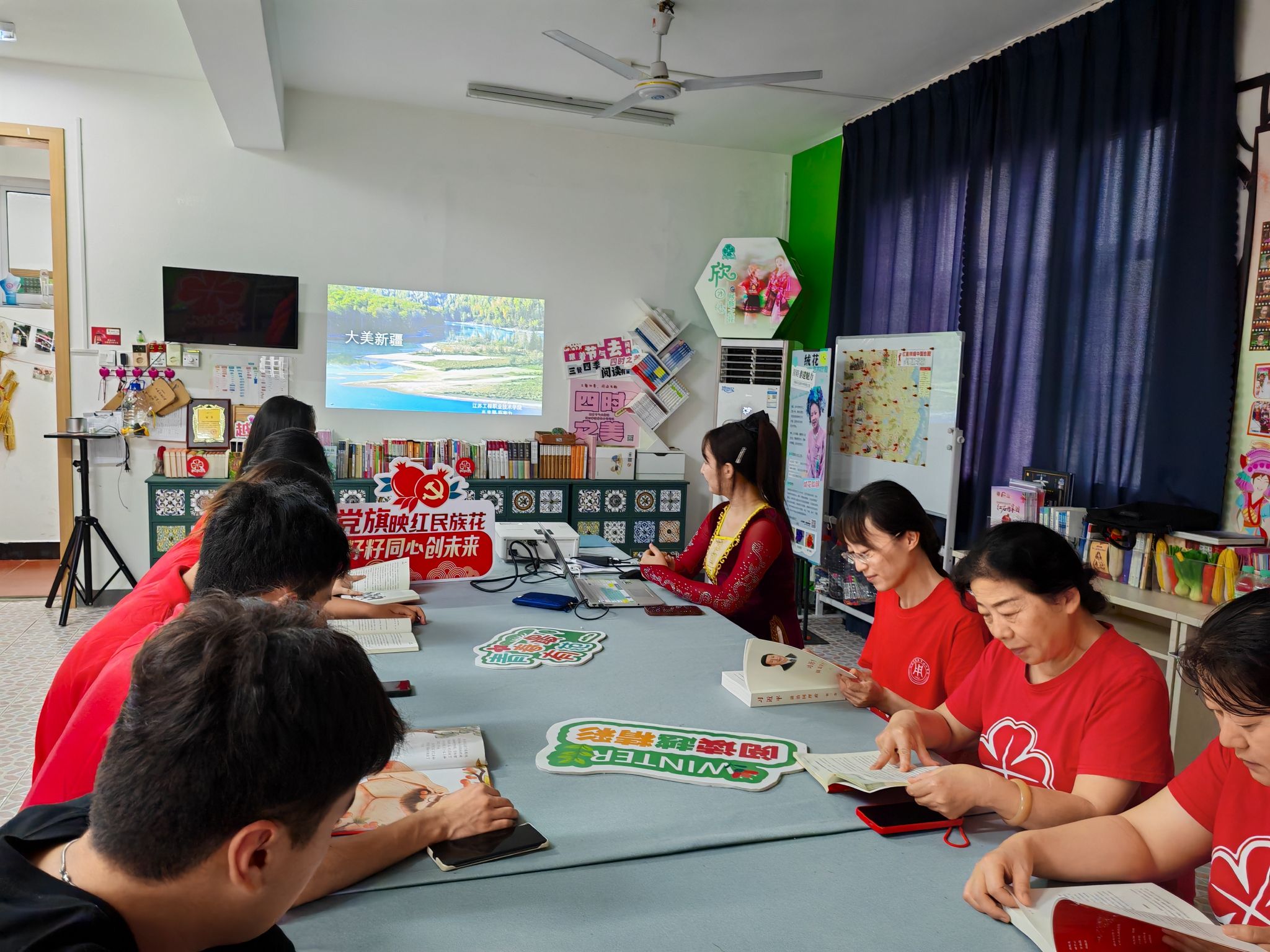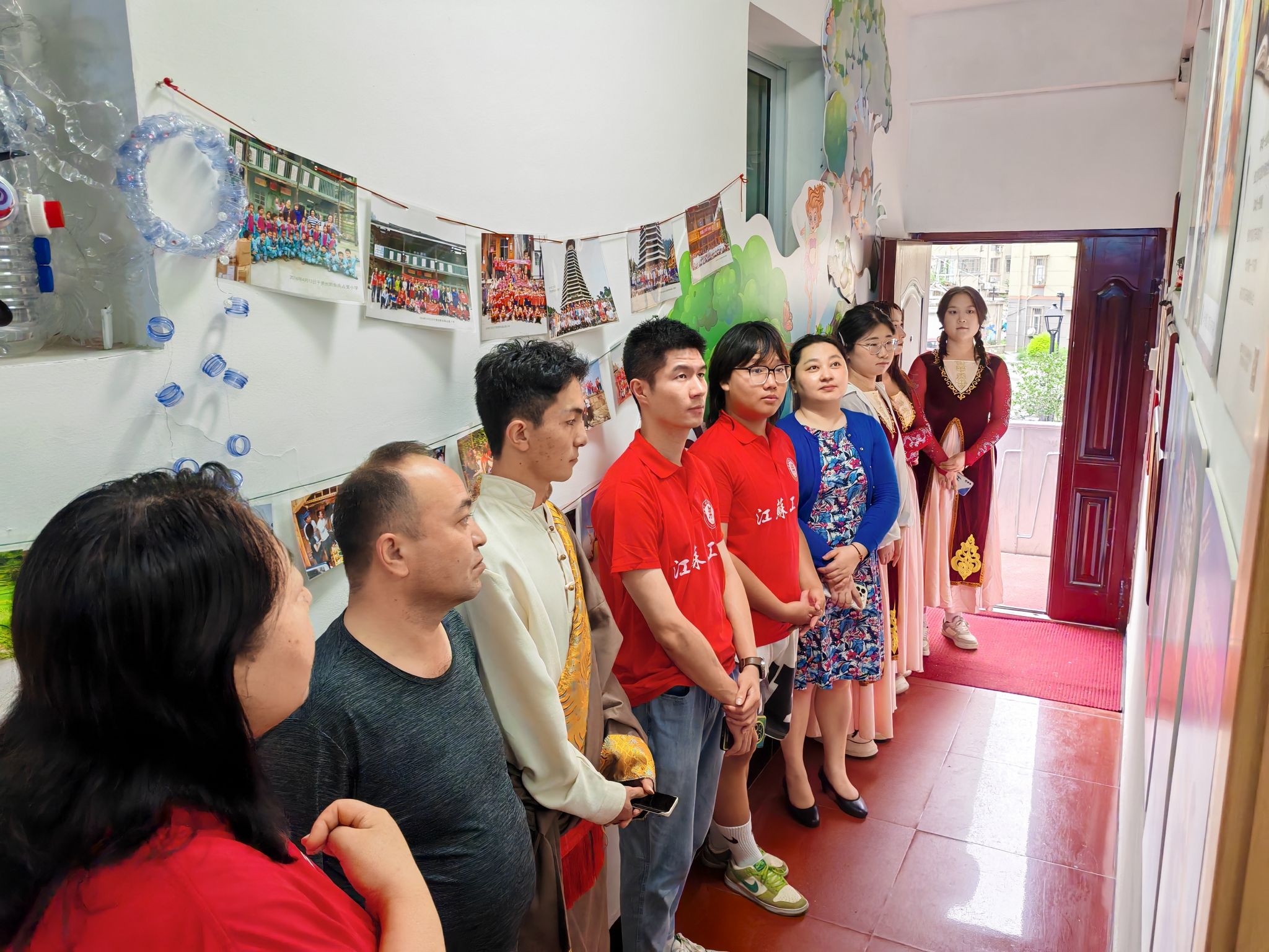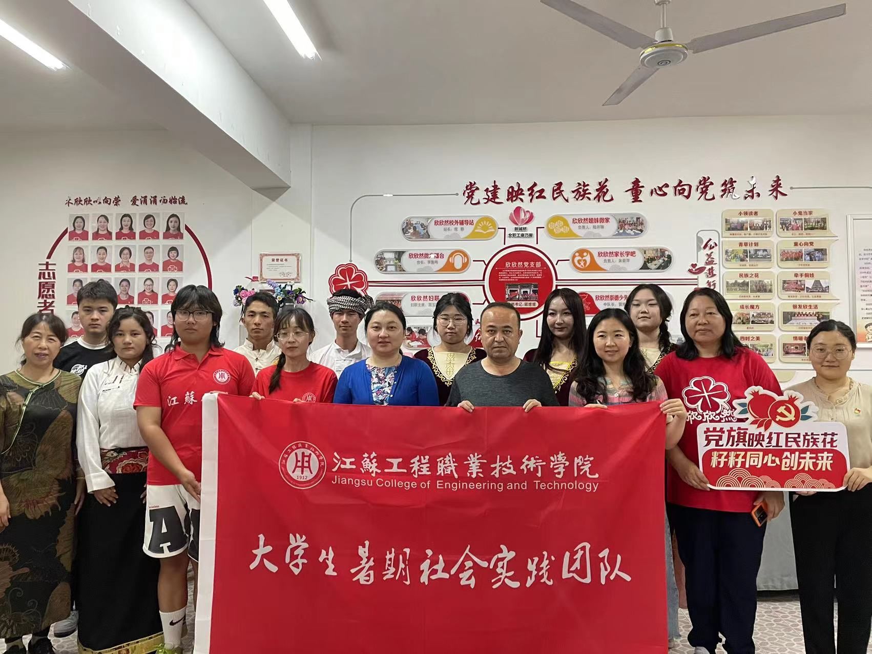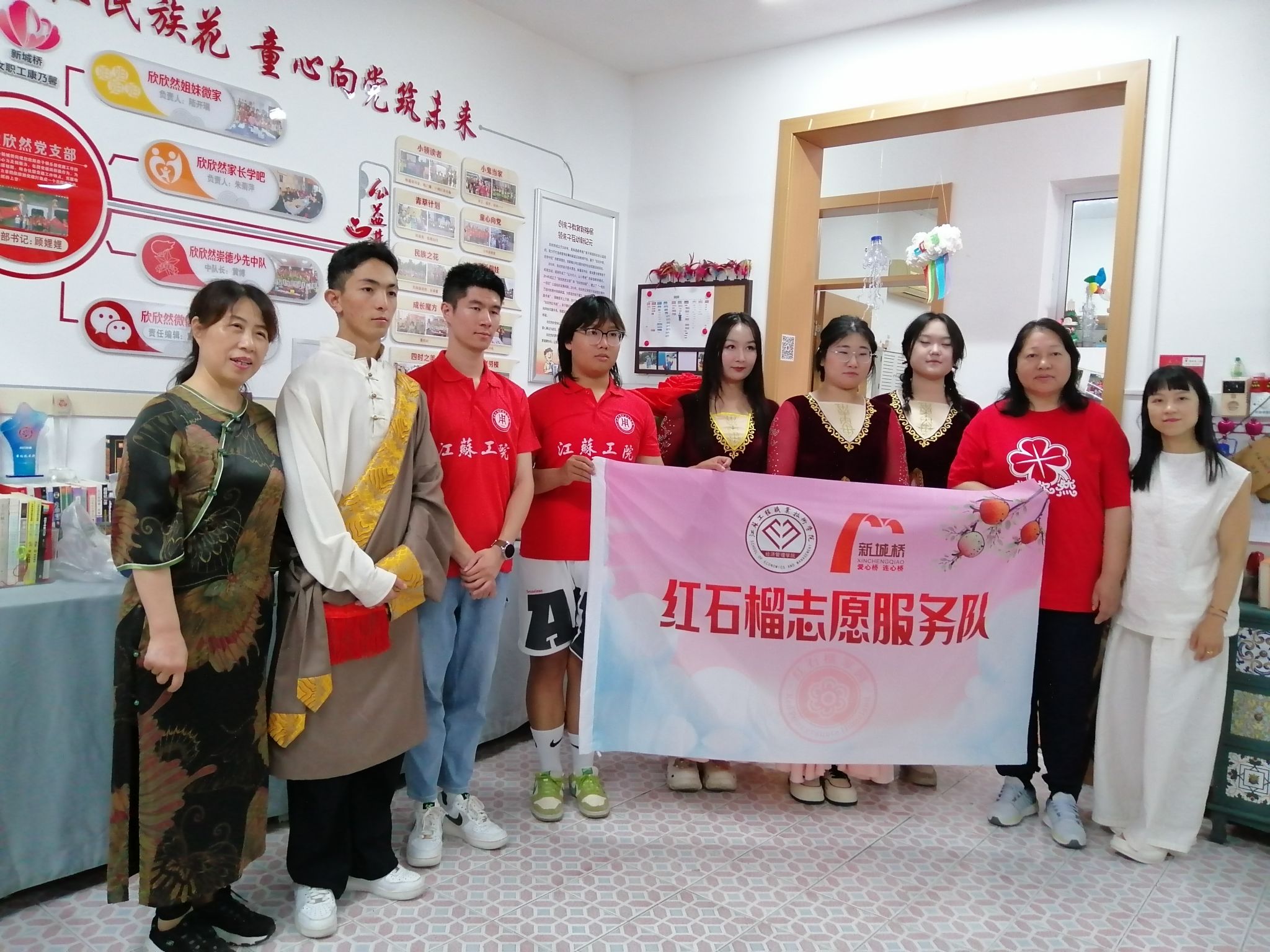 范晔和余小双共同为本次社会实践基地揭牌,陈蓉芳和周玉暄共同签署了校地共建协议并为江苏工院志愿服务团队授旗。周玉暄带领我校青年志愿者、老师参观红石榴家园,围绕家园内“蓝印花布墙”“牵手侗娃”“民族服饰墙”等板块一一介绍,让我校学子们对民族文化特色有了进一步的了解,对民族团结有了新的认识。志愿者们共同阅读红色书籍、学习红军粮的故事、观看纪录片《欣欣然的世界》。