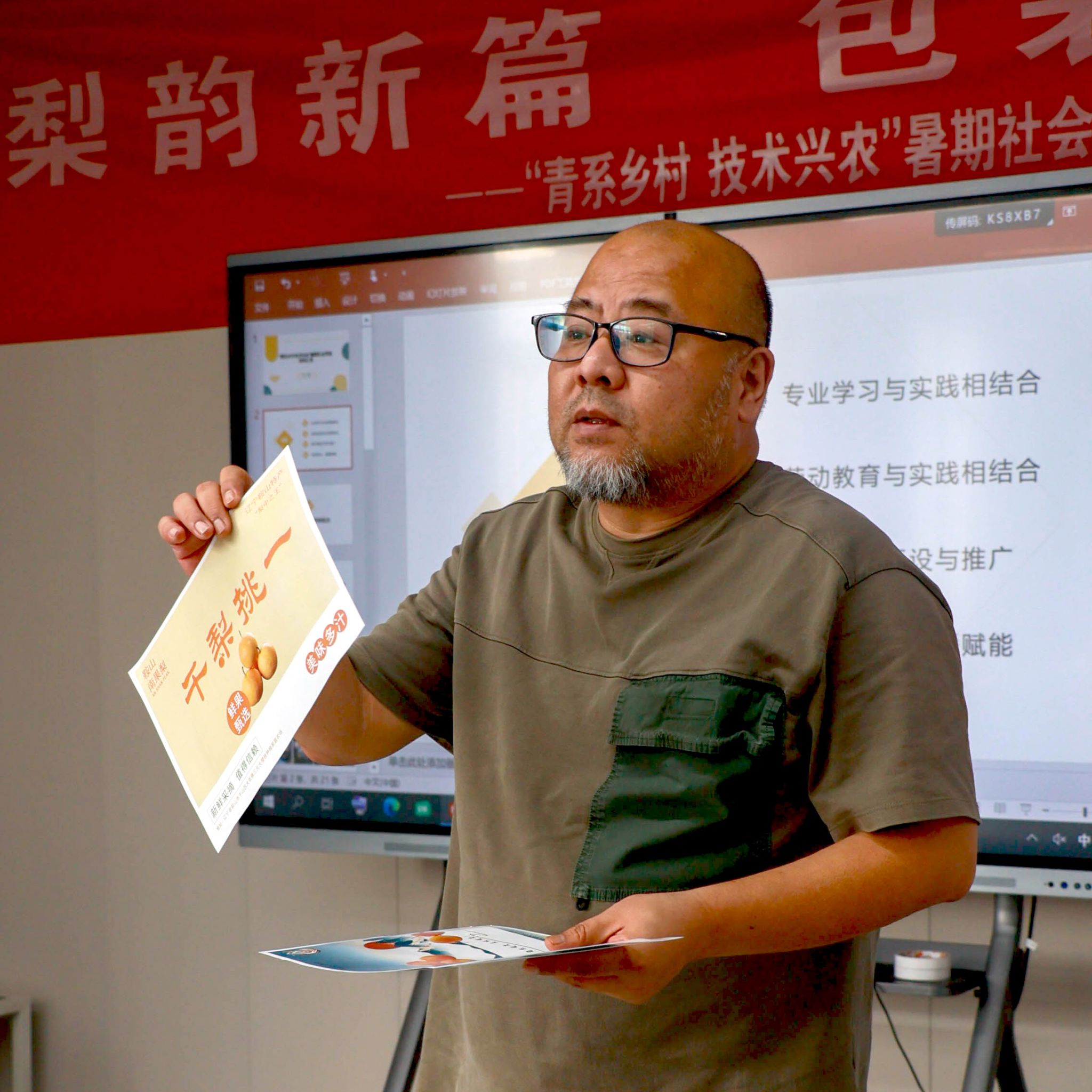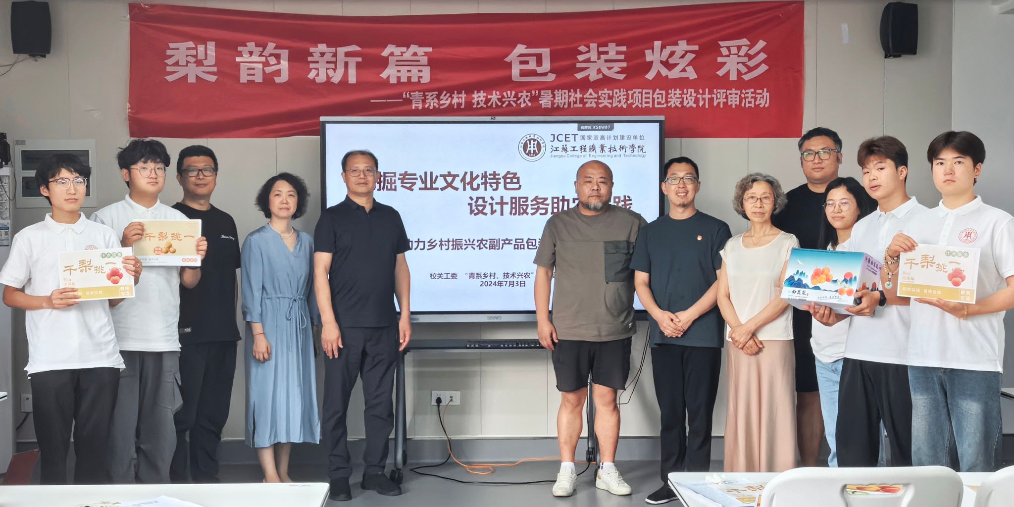 7月3日下午,校关工委与艺术设计学院共同组建的“青系乡村、技术兴农”学生暑期社会实践团在有恒楼222室举办了一场特殊的包装设计评审研讨会:“梨韵新篇 包装炫彩”——江苏工院助力乡村振兴项目暑期实践启动仪式暨辽宁鞍山南果梨包装设计作品评审活动。校关工委常务副主任季跃东,校工会主席、离退休处长、关工委秘书长程莉,艺术设计学院院长任健,副院长汪智强,党总支副书记赵喜恒,艺术设计学院关工委常务副主任姜淑媛出席活动,参加研讨活动还有专业教师丁建、许可以及实践团队的老师和学生。