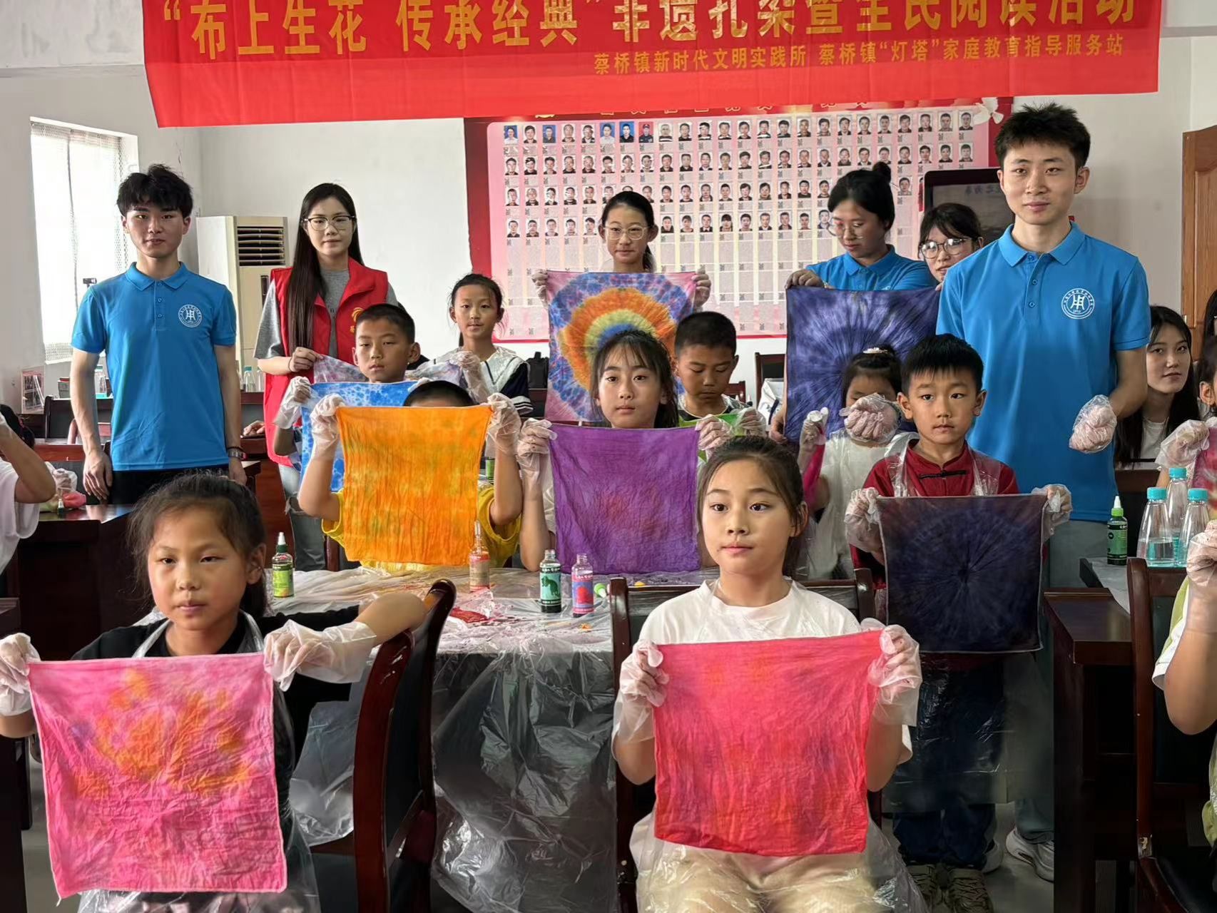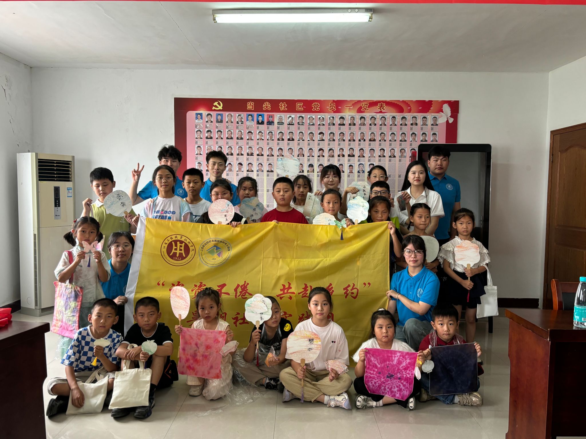 为关爱乡村留守儿童,促进乡村美育发展,实践团走进滨海县当尖党群服务中心“爱心暑托班”开展扎染和漆扇体验活动。在活动中,团队成员向小朋友们介绍了扎染和漆扇的发展历史,讲解了具体操作流程,教大家如何通过折叠、捆绑、设计和浸染等手法逐步制作出心仪的作品。经过一个小时的动手制作,小朋友们完成了作品,互相探讨交流彼此的心得体会,在体验中感受非遗文化的魅力,真正将乡村美育落到实处。