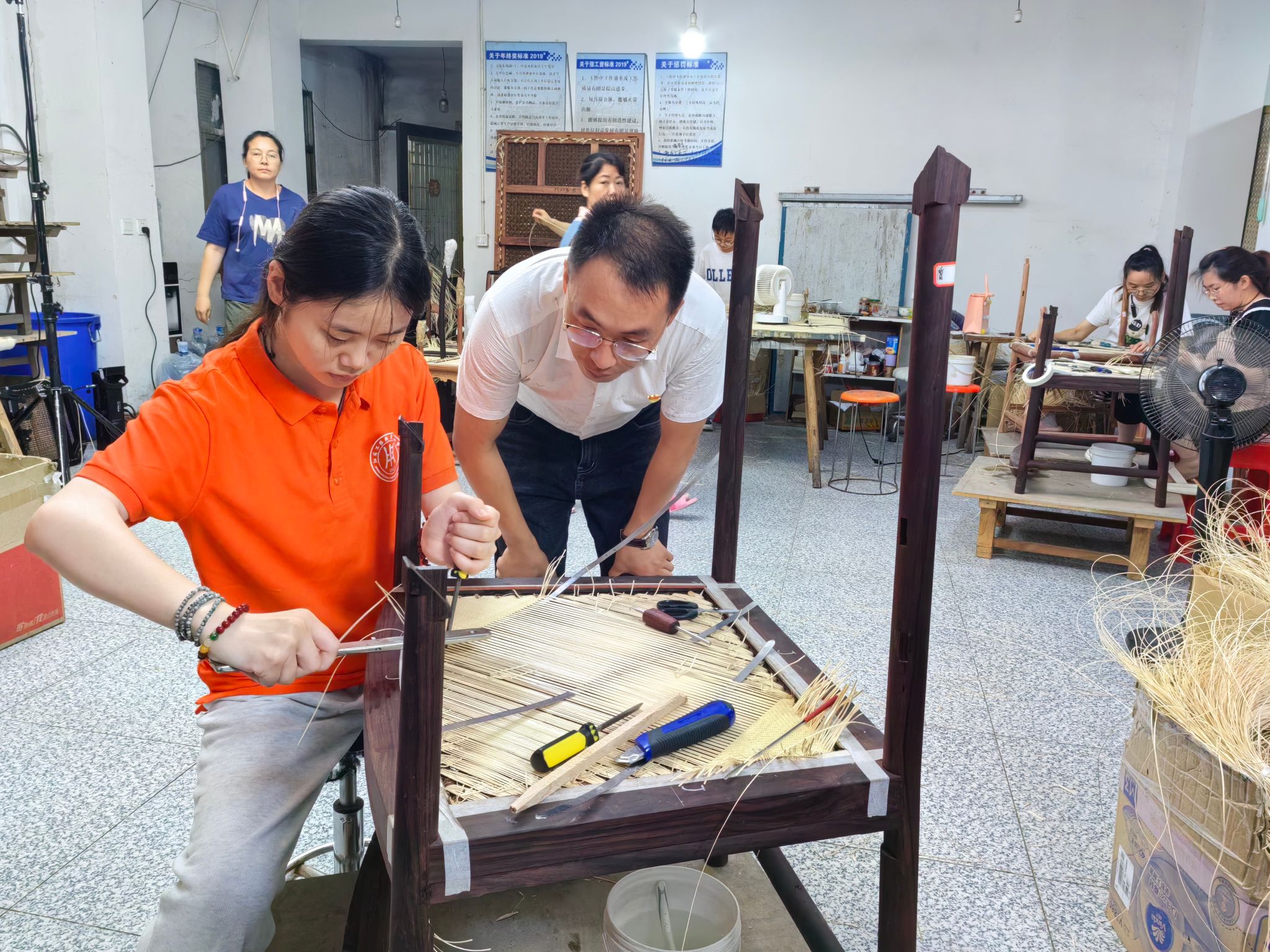 探访当天,肖老师向团队成员分享了自己学艺成长的故事,带领大家参观了肖记藤制品厂生产线。团队成员在体验湿棕绳穿网和编藤后不禁感叹道:“藤编技艺既是力气活,也是精细活,要向手艺人致敬。”当团队成员问到关于藤编手艺传承与发展时,肖老师表示只要有人愿意学,他就愿意教。希望大家学到一技之长,通过手艺致富,这是藤编手艺的魅力,也是他“守艺”的价值所在。