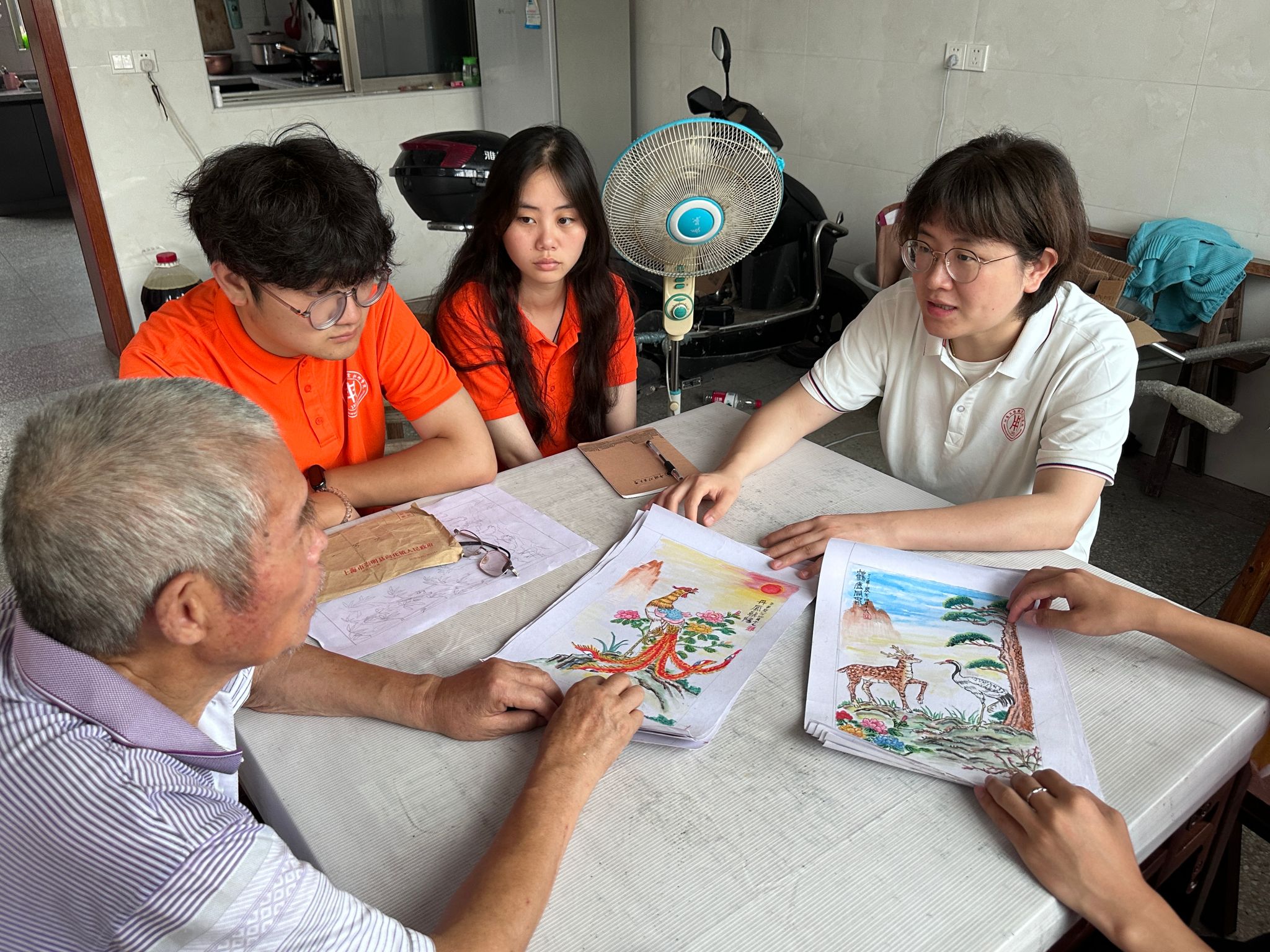 南通市非物质文化遗产“沙地灶头画”代表性传承人杨锦辉已83岁,灶画成了他生命中不可或缺的一部分。看到实践团队一行人来访学习,杨老师非常高兴。他拿出一叠泛黄而珍贵的灶头画画稿,用质朴的语言向我们介绍了年年有余、事事如意、花开富贵、丹凤呈祥等画稿的美好寓意。杨老师现场指导团队成员简单绘制了几笔灶头画,提出了专业的建议,还布置了作业让成员回校后认真完成。老一辈手艺人的精湛技艺和他们对工艺的执着追求,让考察团成员们深受启迪和鼓舞。