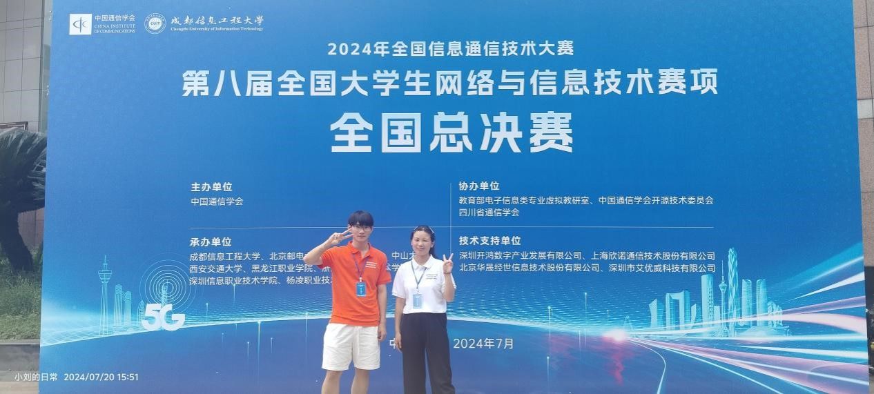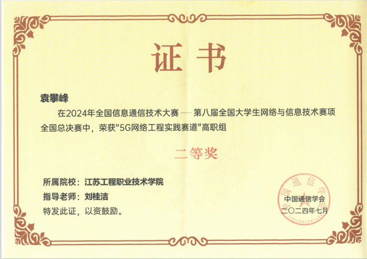 近日,由中国通信学会主办,北京邮电大学、西安交通大学、南京邮电大学等高校承办的第八届全国大学生网络与信息技术大赛成功举办。信息工程学院23移动通信班学生袁攀峰在刘桂洁老师指导下,荣获“5G网络工程实践赛道”高职组赛项二等奖。