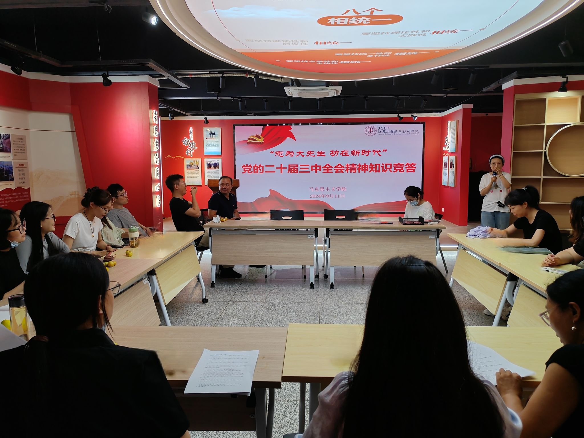 随后,全体教师参加了现场知识竞答。通过必答题、抢答题、组合题等多种形式,全面考查了思政教师们对党的二十届三中全会精神的学习领会程度,切实把学习教育成果转化为推动思政教学工作的强大动力,展现了新时代思政教师的精神风貌。(马克思主义学院 胡梦莉/文 沈南、吴露/图 张甜甜/推荐 钱晋/审核)