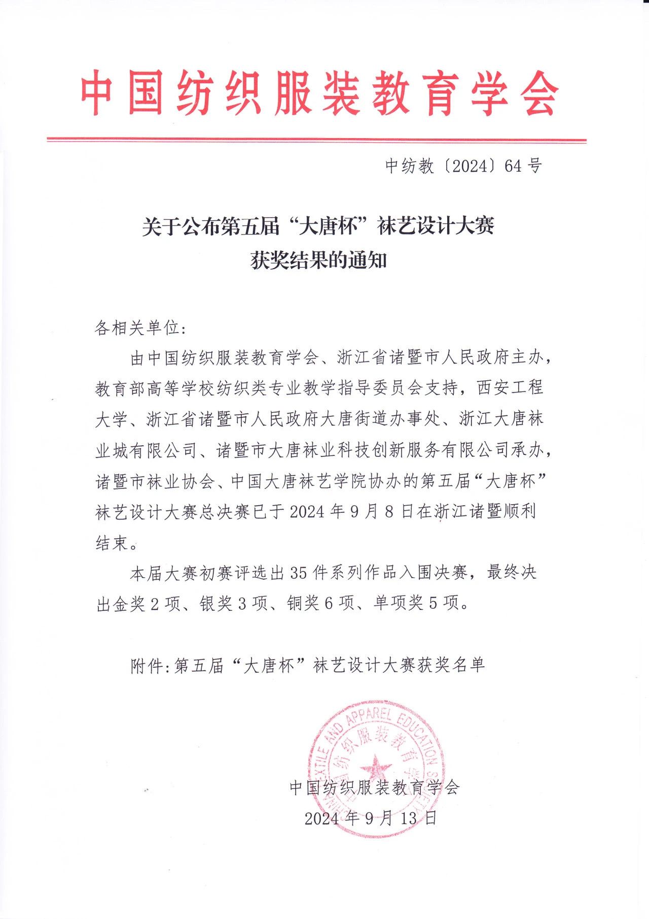 中国“大唐杯”袜艺设计大赛创立于2016年,历时八年,大赛由中国纺织服装教育学会、浙江省诸暨市人民政府主办,教育部高等学校纺织类专业教学指导委员会为支持单位,西安工程大学、浙江大唐袜业城有限公司、浙江省诸暨市人民政府大唐街道办事处、诸暨市大唐袜业科技创新服务有限公司承办,诸暨市袜业协会、中国大唐袜艺学院、浙江大唐纺织科技开发有限公司协办,是行业内高规格重要赛事之一。(艺术设计学院 管蓓莉/文图 蔡媛媛/推荐 彭曼/审核)