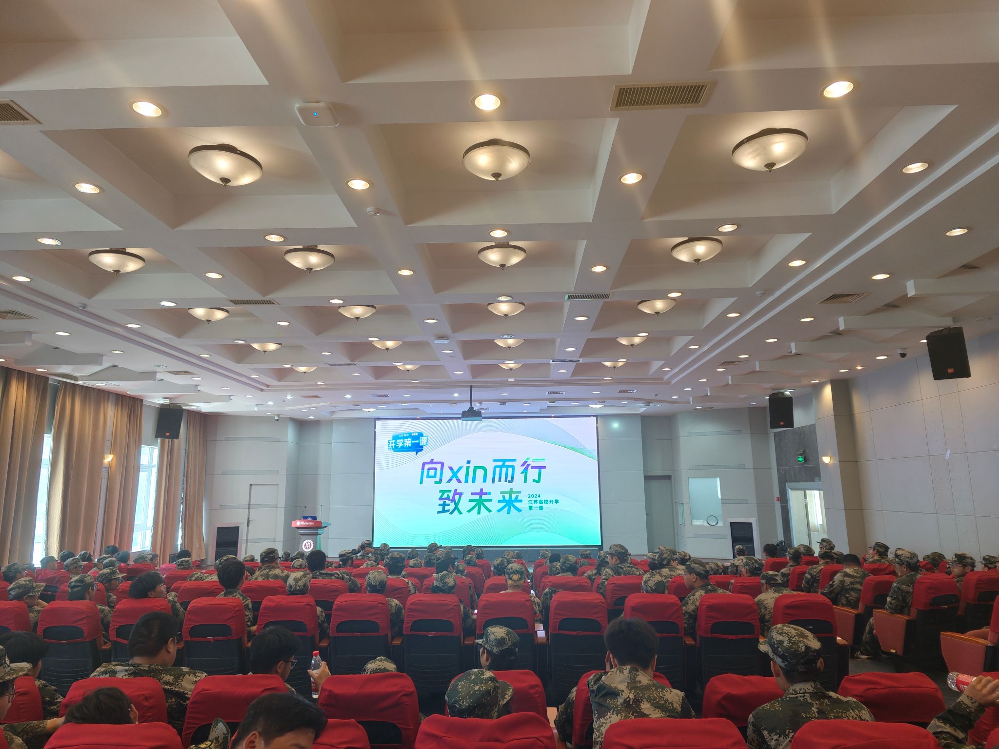 9月29日上午9点,我校组织200余名新生代表在致知楼报告厅集中观看2024年江苏高校“开学第一课”。同时,全校近5000名新生以各种方式观看了线上直播。