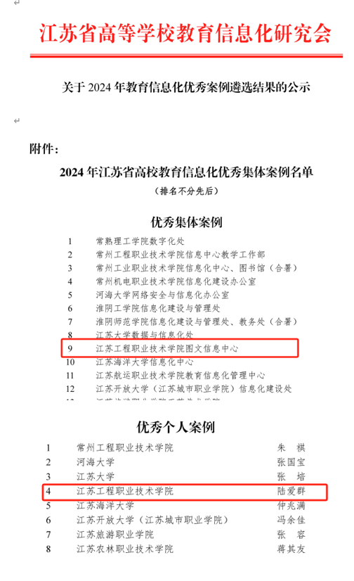 近日,由江苏省高等学校教育信息化研究会主办的2024年江苏省高等学校教育信息化优秀案例公布了遴选结果,我校图文信息中心申报的集体案例《校园网络新思考:如何高速又高效》和个人案例《智慧校园一卡通电子劵应用特色案例》成功入选2024年江苏省高校教育信息化优秀集体案例和优秀个人案例。
