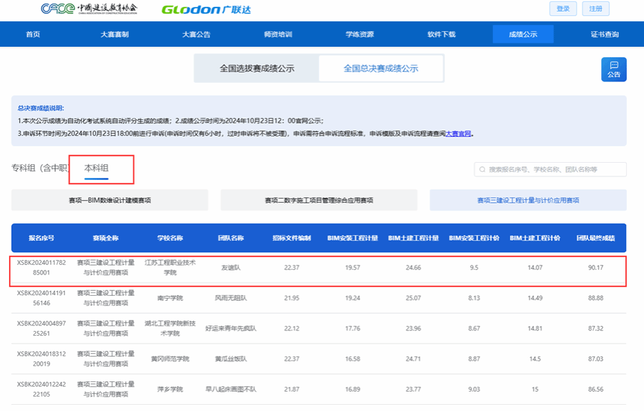 10月19日,由中国建设教育协会主办,广联达科技股份有限公司协办的“2024年全国数字建筑创新应用大赛”圆满结束。我校建筑工程学院2021级工程造价(4+0)专业秦佳慧、周晨、陈悦三位同学在吴志红、徐圣楠、孙鹏璐等老师的指导下,参加了“建设工程计量与计价应用赛项”本科组的比赛,获得了全国选拔赛和总决赛第一名的好成绩。