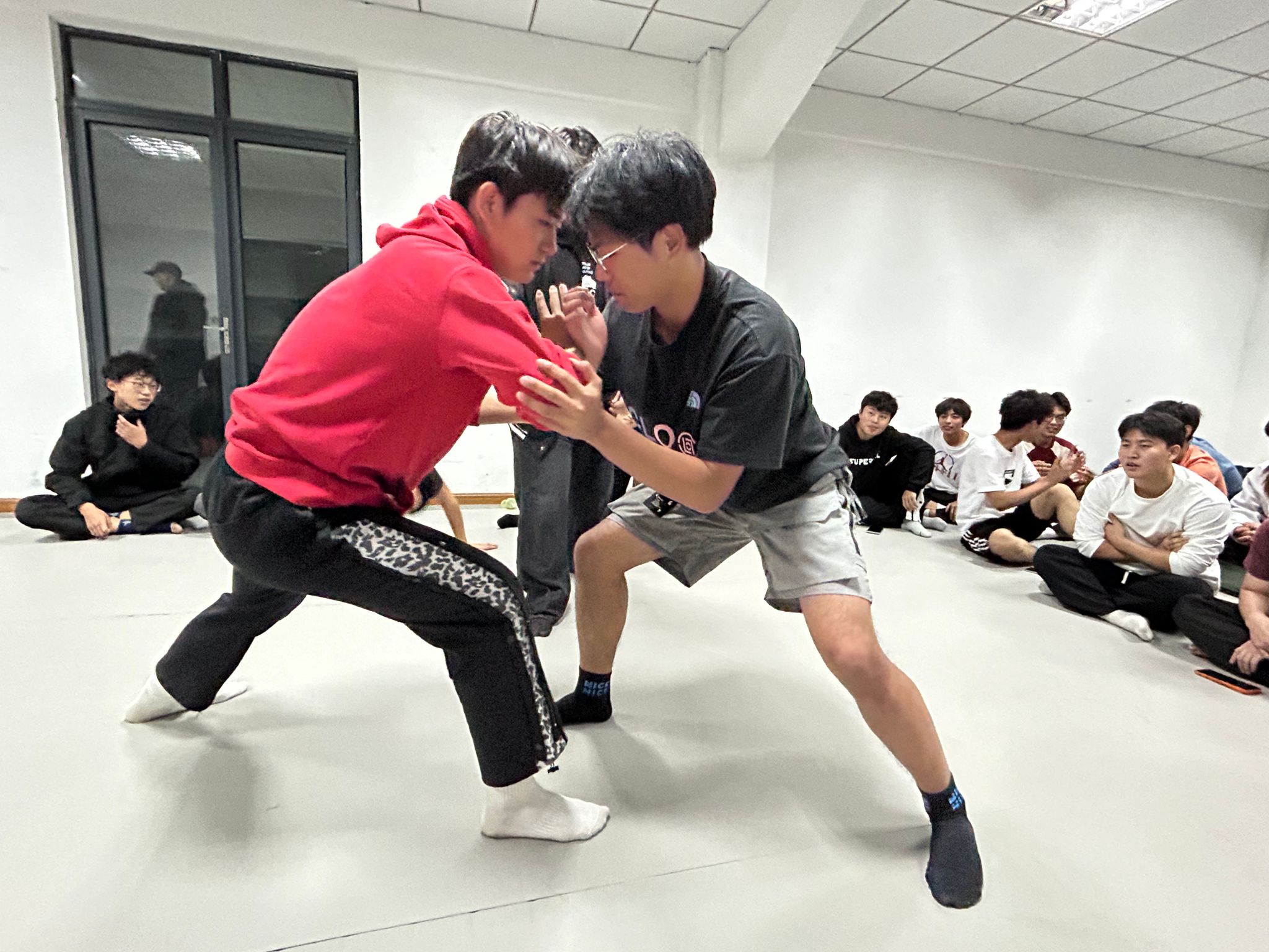 本次活动包括练习感悟和切磋体验两部分。获得中国大学生太极推手锦标赛冠军的几位同学分享自己练习和参赛的经历和感悟。体育部王武浩老师讲解了太极推手基本规则,同学们积极踊跃地参与了切磋体验。