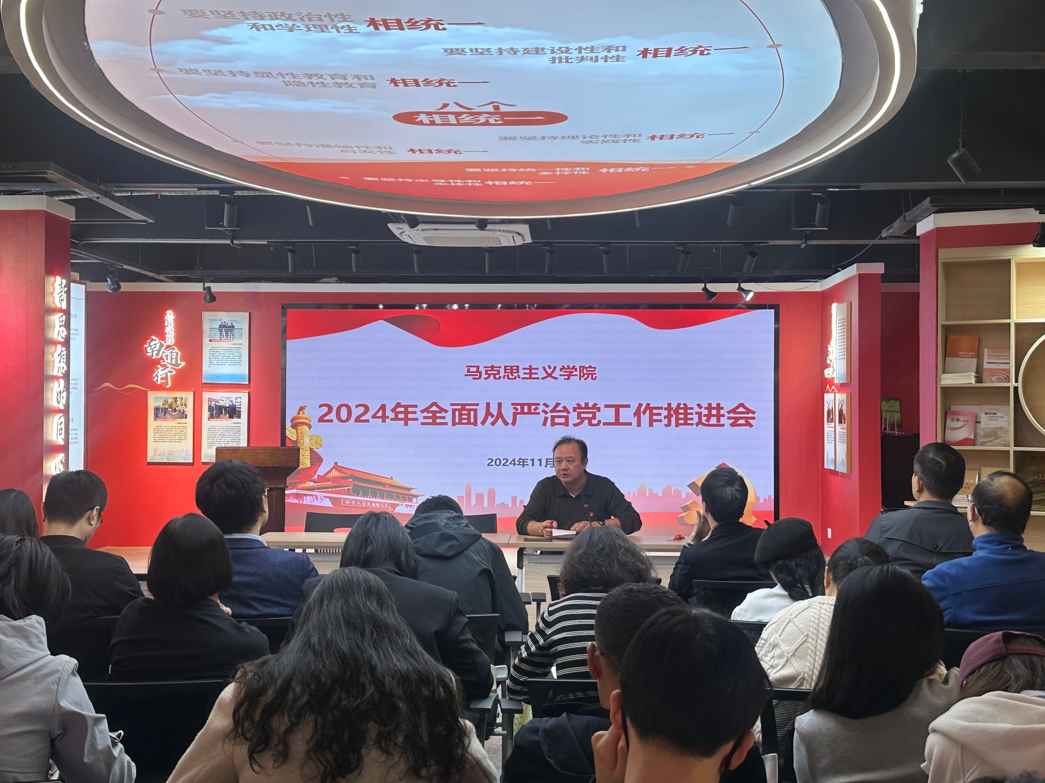 11月6日下午,马克思主义学院党总支在新思想践悟馆召开2024年全面从严治党工作推进会。学院领导班子及全体教职工参加会议,会议由学院党总支书记钱晋主持。