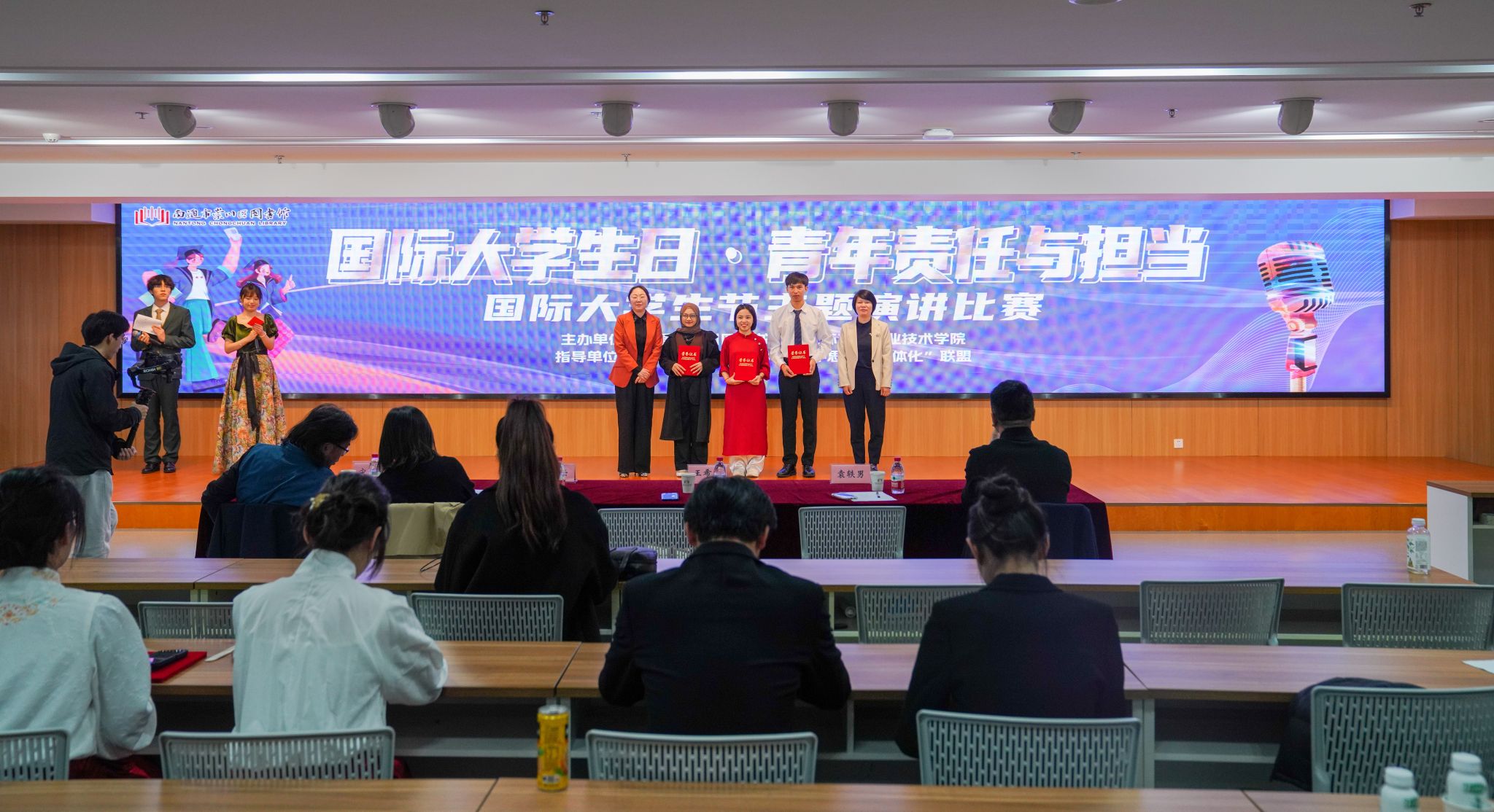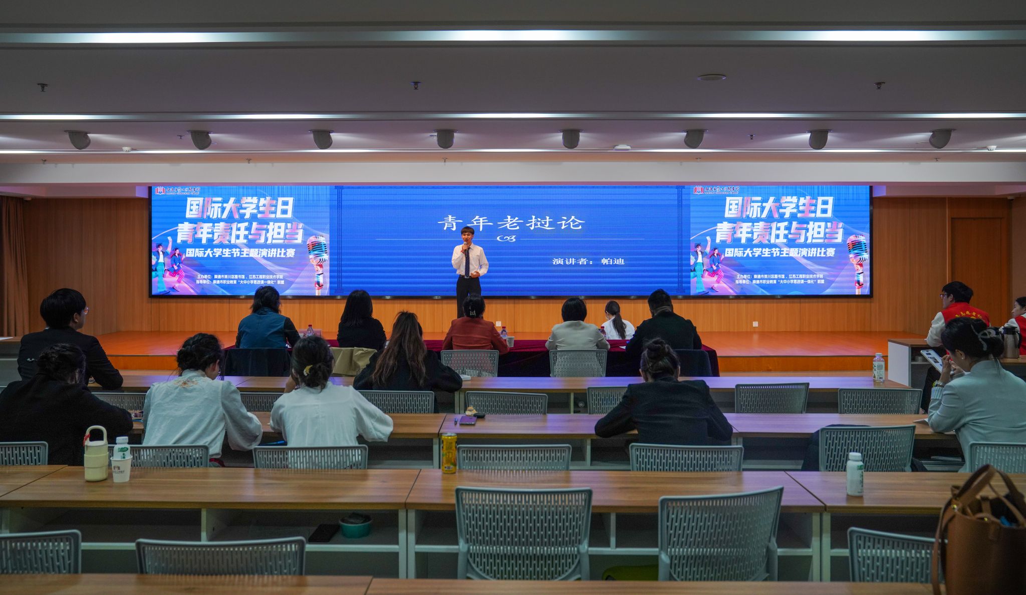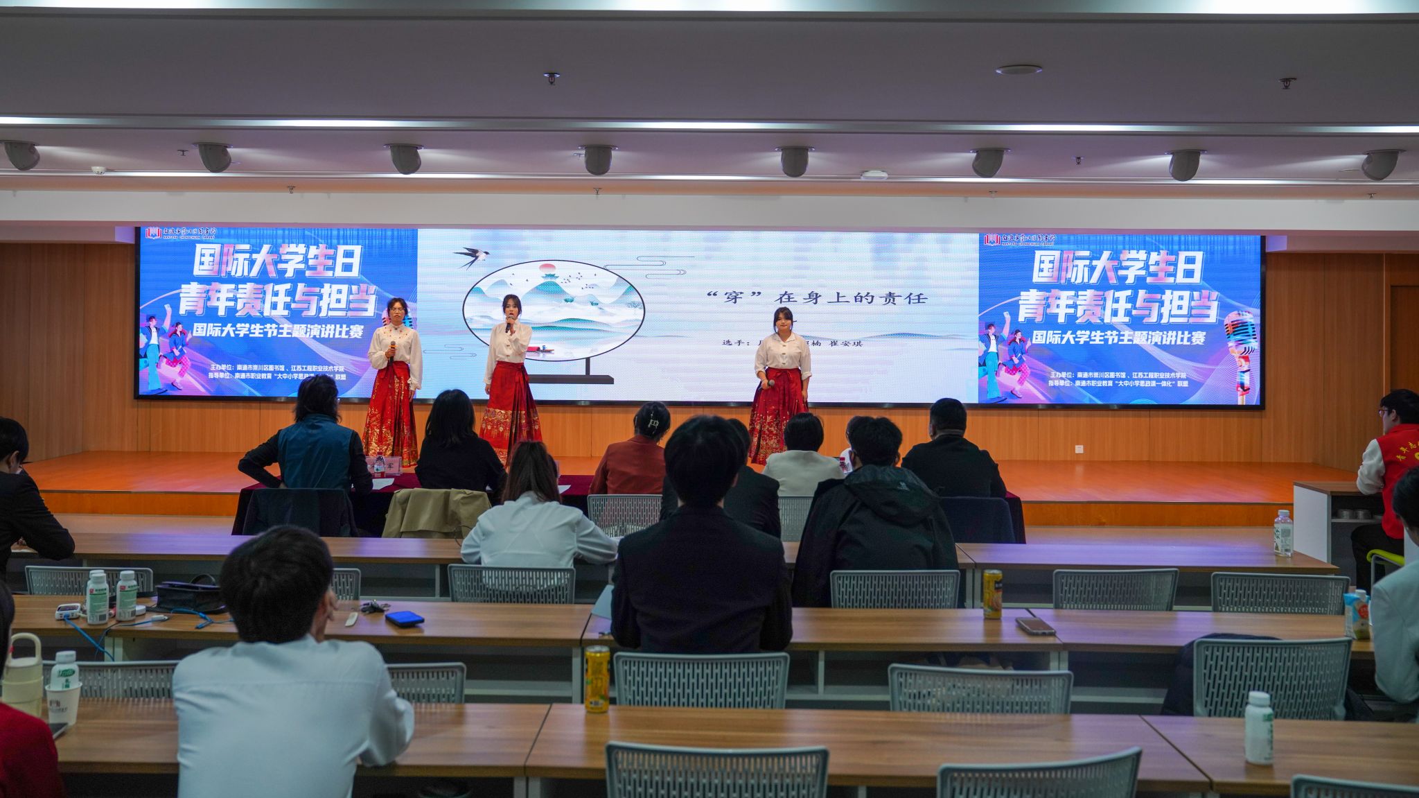 今年的11月17日是第78个国际大学生节。为呼吁广大青年学子勇担强国建设、民族复兴的职责使命,由我校和崇川区图书馆联合主办、南通市职业教育“大中小学思政课一体化”联盟指导、以“国际大学生日·青年责任与担当”为主题的演讲比赛在崇川区图书馆举行。校党委委员、宣传部部长王希颖,南通市崇川区文化艺术中心主任袁轶男,南通日报社理论评论部主任唐彦云,南通无限广告公司总经理宋亚军,江苏省曲艺家协会、江苏省戏剧家协会会员、南通市曲艺家协会、南通市朗诵学会副秘书长杨宝红等受邀担任评委。