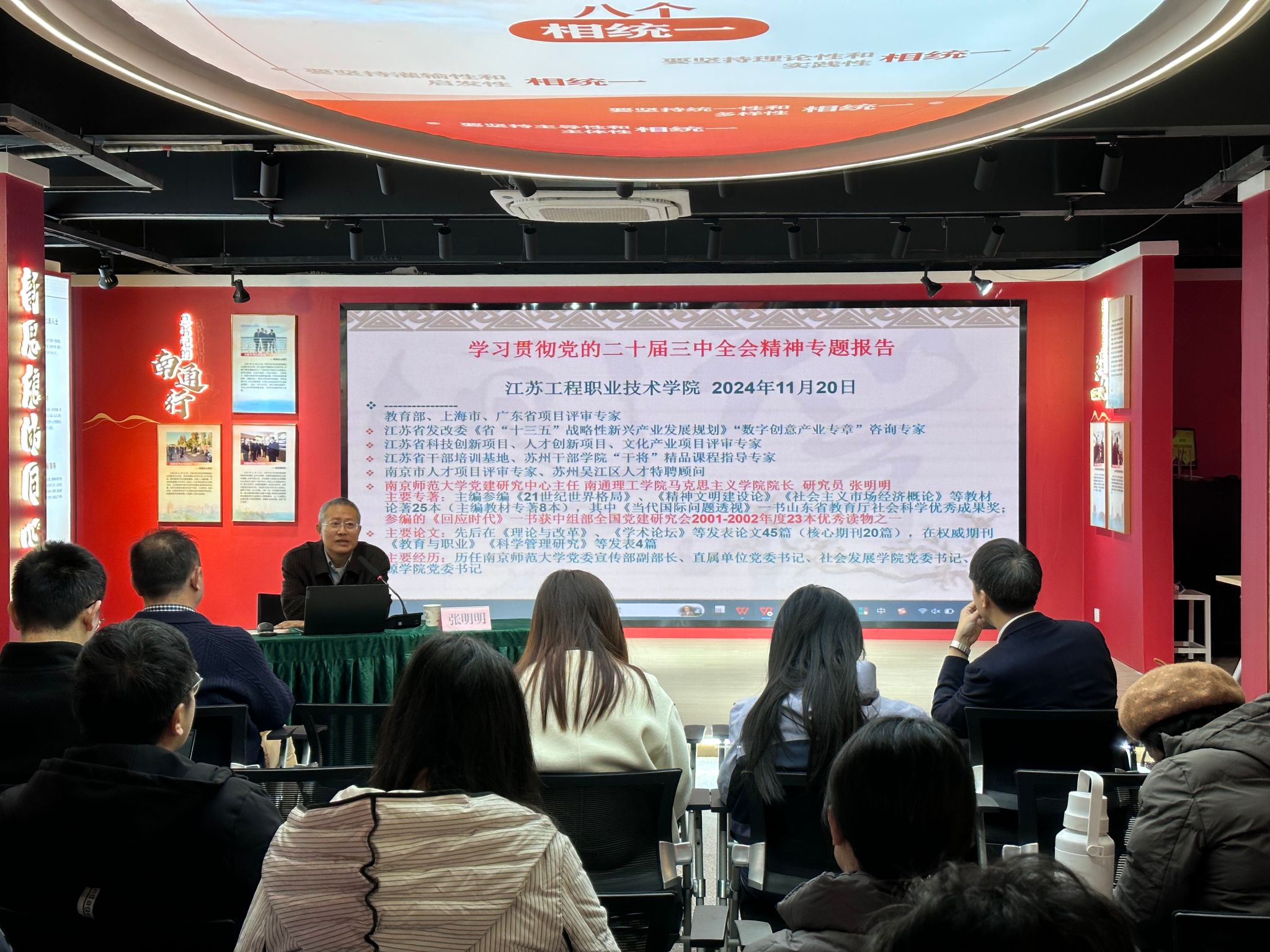 11月20日上午,马克思主义学院邀请南京师范大学党委宣传部原副部长、南通理工学院马克思主义学院院长张明明教授为全体思政课教师作专题讲座。学院副院长朱建主持活动。