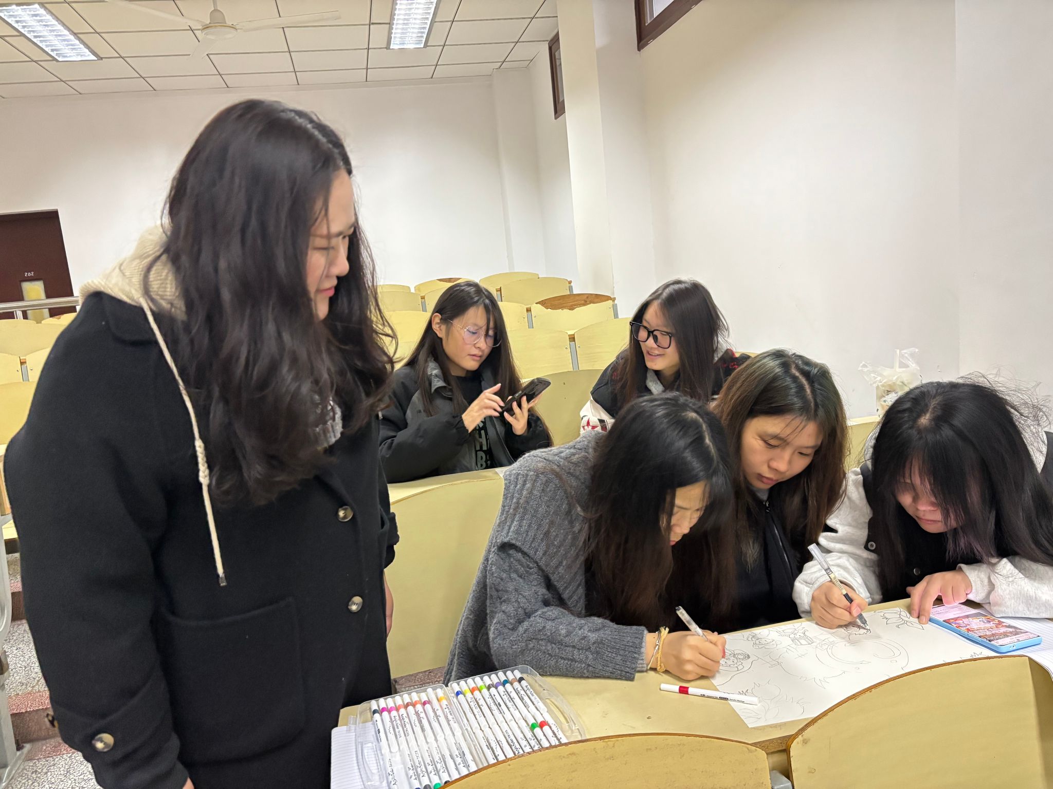 课堂上,高飞向同学们介绍了我校“红石榴”辅导员工作室的基本情况。韩琦老师向同学们讲解了“红石榴”工作室logo的设计理念,并指导同学们以“红石榴”工作室的logo为蓝本,结合本门课程所学内容,进行以民族团结为主题的图标绘画创作活动。在创作过程中,韩琦和张驰越分别以“一带一路”“茶马古道”等主题内容为线索,引导同学们用“丝带”“石榴籽”“数字56”等元素进行绘画创作。同学们在创作结束后还上台分享了自己的创作思路,在交流中增强了对民族团结的理解,加深了对“我们都是中华民族共同体的一员”的情感认同,坚定了对“我们都要身体力行建设中华民族共同体”的信念。