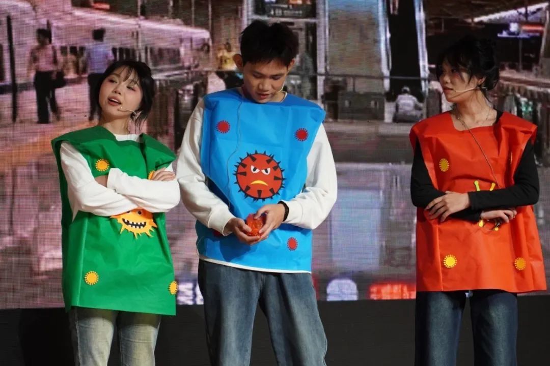 在比赛中,纺织服装学院学生代表队以其精湛的演技和真挚的情感,将作品的主题和内涵完美呈现在舞台上。作品巧妙地从病毒的视角出发,通过生动的表演和细腻的剧情设计,向观众揭示了艾滋病传播的三大主要途径。同时,作品采用小剧场分镜头的表现形式,将人类与病毒的抗争之路划分为多个场景,逐一呈现,让观众在欣赏剧情的同时,更加深入地了解了艾滋病的防治知识和救护技能。