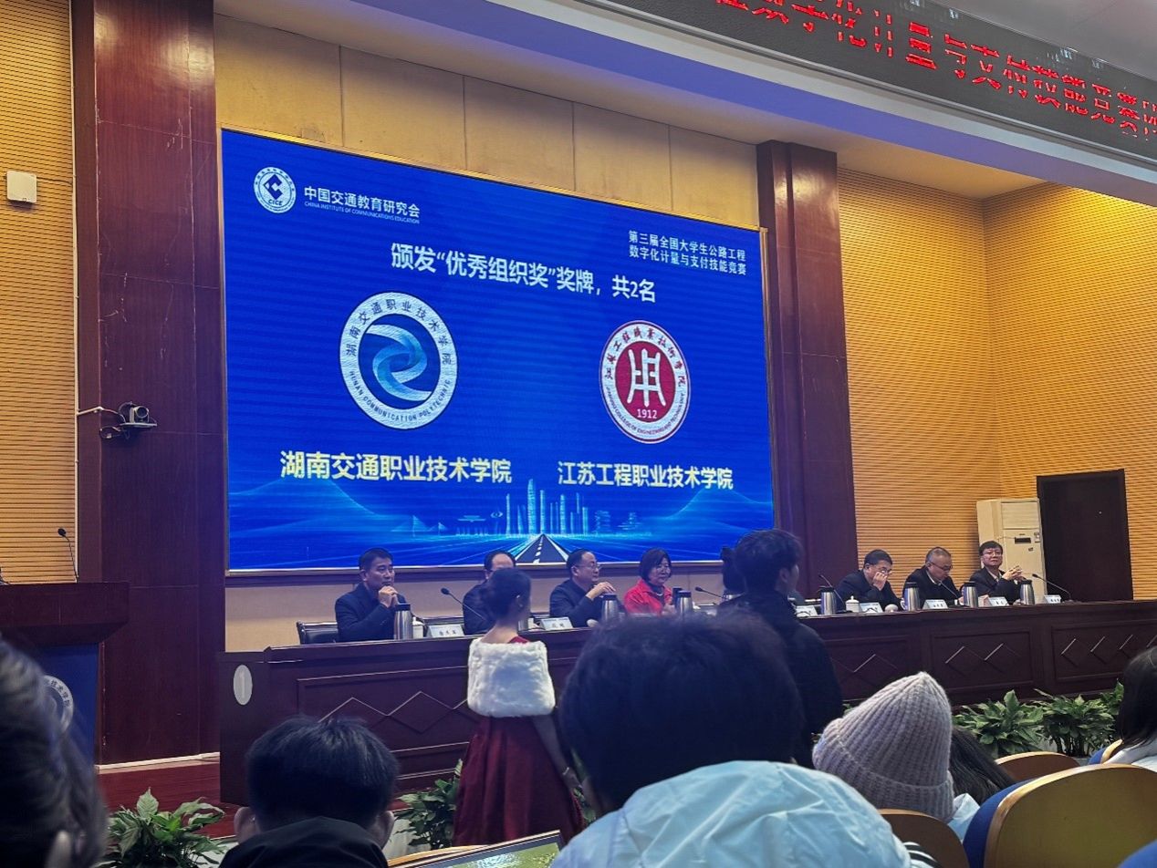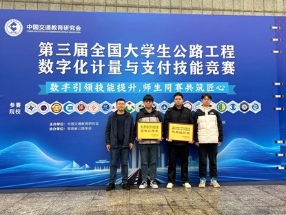 12月4日—6日,由中国交通教育研究会主办的第三届全国大学生公路工程数字化计量与支付技能竞赛在湖南交通职业技术学院举办。我校由建筑工程学院道路与桥梁工程技术专业3名同学组成的代表队与来自全国进入决赛的33支学生代表队同场竞技,荣获团体三等奖的佳绩,我校获得“优秀组织奖”称号。