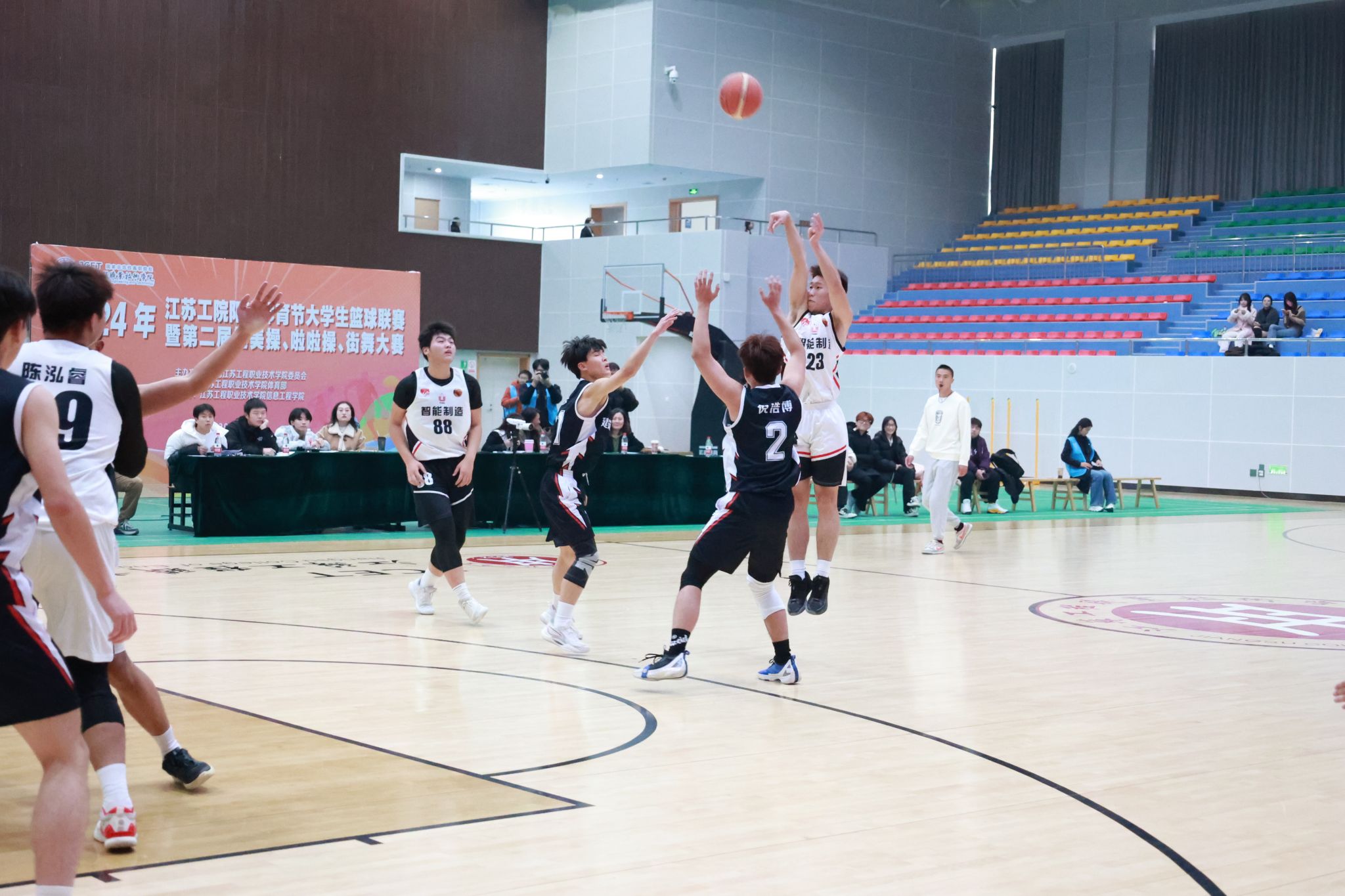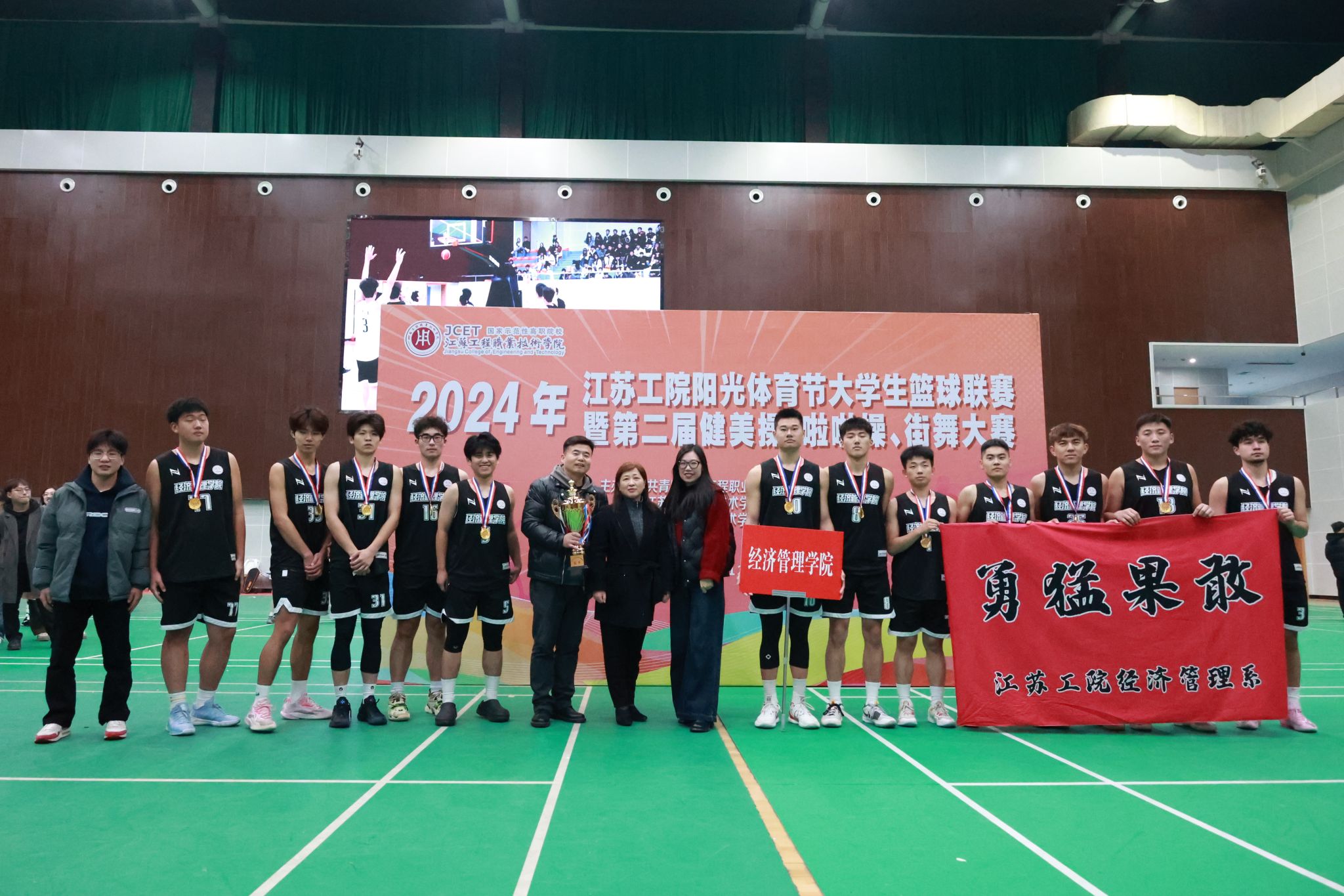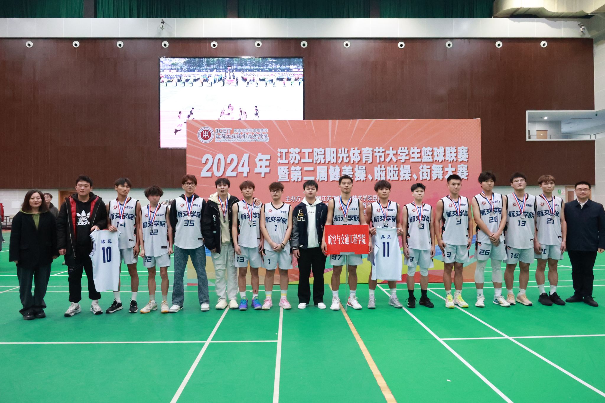 12月7日,由校团委和体育部共同主办,信息工程学院承办的江苏工院大学生篮球联赛决赛暨第二届健美操、啦啦操、街舞比赛在崇川校区体育馆举办。校党委委员、副校长丛彬彬,团委书记徐磊,信息工程学院党总支书记朱建泉,基础教学部党总支书记顾晓梅,体育部主任吴春成,团委副书记张禧嘉等出席了闭幕仪式并为获奖队伍颁奖。