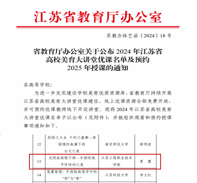 近日,江苏省教育厅公布《省教育厅办公室关于公布2024年江苏省高校美育大讲堂优课名单及预约2025年授课的通知》(苏教办体艺函〔2024〕18号),我校基础教学部夏蕾老师主讲的课程《光阴流转情不移——中国传统节序诗词之美》成功入选,这也是我校基础部的美育课程第二次入选该项目。本次优课评选,全省共有88所本专科院校的154门课程参评,经省教育厅组织省外专家初评、复评,最终遴选出30门课程,全省仅有4家高职院校入选。